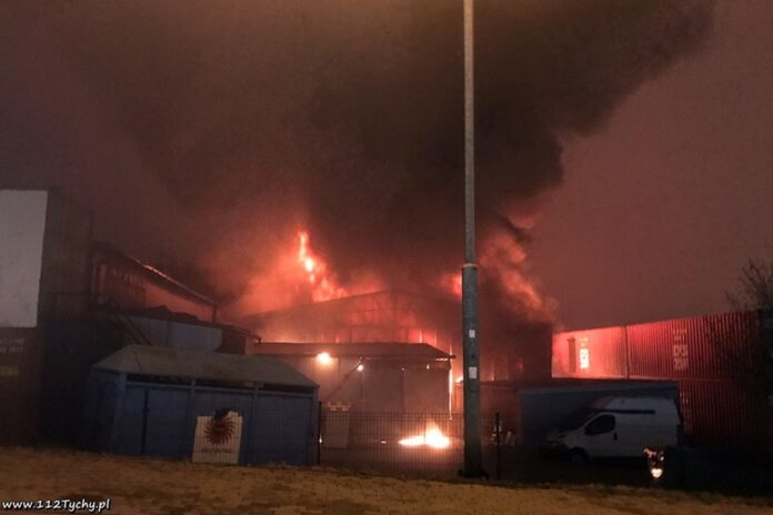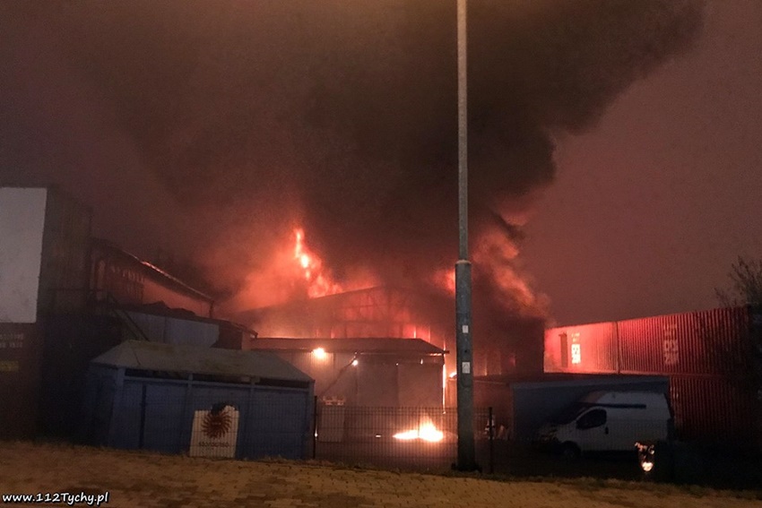 23 listopada około godziny 21.50 dyżurny SKKP PSP Mikołów otrzymał zgłoszenie o pożarze hali magazynowej przy ulicy Gliwickiej. Na miejsce natychmiast zadysponowane zostały zastępy JRG Mikołów oraz kilka podległych jednostek OSP. Po dotarciu na miejsce strażacy zastali rozwinięty pożar hali, który zagrażał sąsiedniej. KDR drogą radiową poprosił o dodatkowe SiŚ. Na miejsce pożaru zadysponowane zostały kolejne zastępy jednostek OSP oraz ciężkie plutony gaśnicze z JRG Katowice i JRG Tychy. Ze względu na bardzo duże zadymienie na miejsce zdarzenia zadysponowany został również zastęp z dodatkowymi aparatami ochrony układu oddechowego i sprężarką do ich napełniania z JRG 1 Sosnowiec. W trakcie działań na miejsce dojechał KP PSP Mikołów, mł. bryg. mgr inż. Damian Krawczyk oraz grupa operacyjna z KW PSP Katowice. Niestety pomimo wysiłku strażaków pożarem zajęła się również druga hala. W kulminacyjnym momencie z pożarem walczyły 23 zastępy PSP i OSP. Pożarem objęte były hale, w których przechowywane były materiały z tworzyw sztucznych. Około godziny 23 sytuacja została opanowana. Dogaszanie pogorzeliska trwało do wczesnych godzin porannych. Miejsce zdarzenia dodatkowo zabezpieczały patrole Policji. Na czas działań zamknięta dla ruchu została ulica Storczyków. Trwa wyjaśnianie przyczyn i okoliczności powstania pożaru.