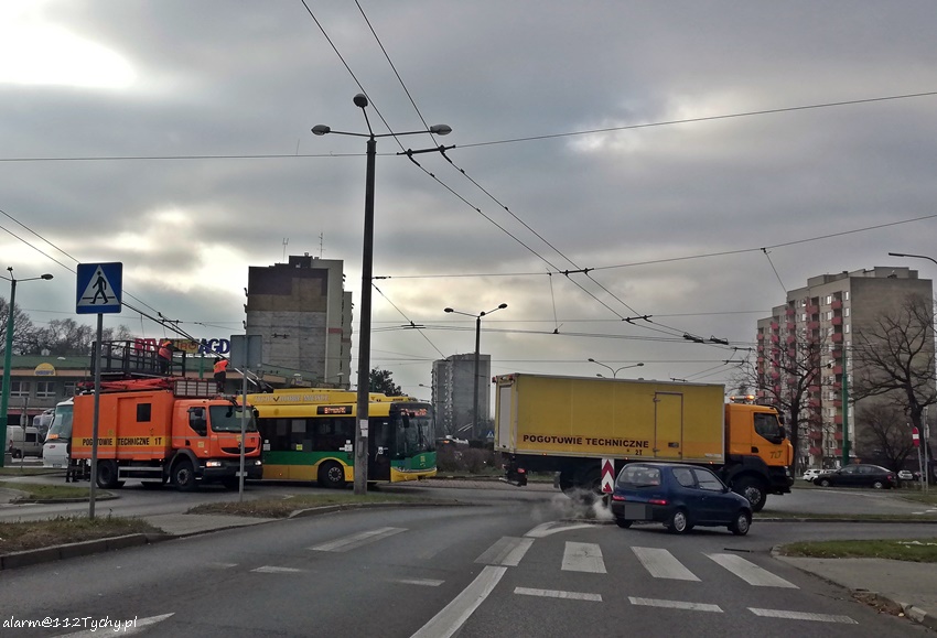 28 listopada około godziny 10.20 na rondzie Olimpijskim (Jana Pawła II – Armii Krajowej – Paprocańska – Wyszyńskiego) doszło do zdarzenia drogowego z udziałem trzech pojazdów – osobowej Mazdy, trolejbusu i autobusu rejsowego. Na miejsce zdarzenia wezwany został patrol Policji. Ze względu na uszkodzenia trolejbusu (pokrzywione szelki) nie było możliwości usunięcia pojazdów z ronda. Na miejsce wezwane zostało pogotowie techniczne TLT, którego pracownicy usunęli uszkodzone szelki, a trolejbus został odholowany z ronda. W wyniku tego zdarzenia nikt nie został poszkodowany. Ze wstępnych ustaleń pracujących na miejscu Policjantów wynika, że winnym spowodowania zdarzenia jest kierująca trolejbusem. Do zdarzenia doszło w momencie gdy kierująca wysiadła z pojazdu gdy doszło do „wyczepienia się” szelek z trakcji – kierująca chciała usunąć usterkę ale najprawdopodobniej zapomniała zaciągnąć ręczny hamulec – trolejbus stoczył się uszkadzajac osobowkę i autobus. Około godziny 11.20 ruch na rondzie został przywrócony. Tyscy Policjanci prowadzą dalsze postępowanie w sprawie tego zdarzenia.