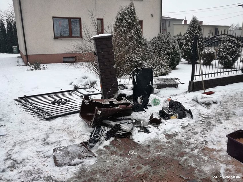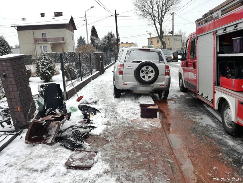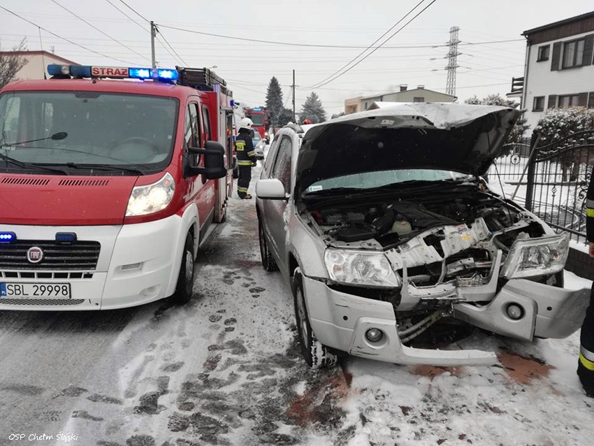26 stycznia kilkanaście minut po godzinie 12 dyżurni SKKM PSP Tychy i KPP Bieruń otrzymali zgłoszenie o zdarzeniu drogowym w Chełmie Śląskim na ulicy Odrodzenia. Ze zgłoszenia wynikało, że kierująca samochodem marki Suzuki uderzyła w ogrodzenie jednej z posesji. Na miejsce natychmiast zadysponowane zostały zastępy OSP Chełm Śląski (GLBARt), JRG Tychy (GBA, SCRt), ZRM i patrol bieruńskiej Policji. Po przybyciu na miejsce zgłoszenie potwierdziło się. Kierująca samochodem (19 – latka) została przewieziona do szpitala na dokładne badania. Strażacy zabezpieczyli miejsce zdarzenia, udzielili poszkodowanej kwalifikowanej pierwszej pomocy, a po zakończeniu czynności przez Policję zneutralizowali plamy płynów eksploatacyjnych. Ze wstępnych ustaleń pracujących na miejscu Policjantów wynika, że kierująca najprawdopodobniej nie dostosował prędkości do warunków panujących na drodze i wpadła w poślizg, a następnie wjechała w ogrodzeni posesji. Utrudnienia w ruchu trwały ponad godzinę. Bieruńscy Policjanci prowadzą dalsze postępowanie w sprawie tego zdarzenia.