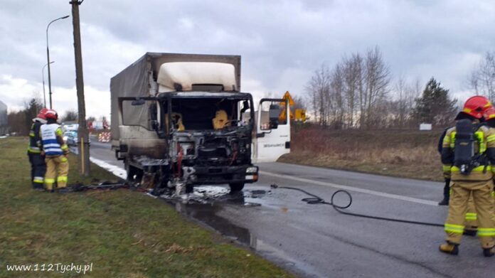 11 lutego około godziny 10 dyżurny SKKMPSP Tychy otrzymał zgłoszenie o pożarze samochodu ciężarowego MAN na tzw. drodze wewnętrznej FCA (równoległa do ul. Turyńskiej). Na miejsce natychmiast zadysponowane zostały zastępy JRG Tychy (GBA, GCBARt, SCRt) i patrol Policji. Po dotarciu na miejsce strażacy zastali pożar kabiny pojazdu ciężarowego. Ruch w miejscu zdarzenia został całkowicie zablokowany. Strażacy w aparatach ochrony układu oddechowego przystąpili do gaszenia – podany został jeden prąd gaśniczy na palącą się kabinę. Po kilkunastu minutach pożar został ugaszony. Dodatkowo na miejsce zdarzenia przyjechał oficer operacyjny KM PSP Tychy (SLRr). Spalony wrak został odholowany przez pomoc drogową. Ze wstępnych ustaleń wynika, że przyczyną pożaru było zwarcie instalacji elektrycznej w pojeździe. Działania na miejscu jak i utrudnienia trwały ponad godzinę.