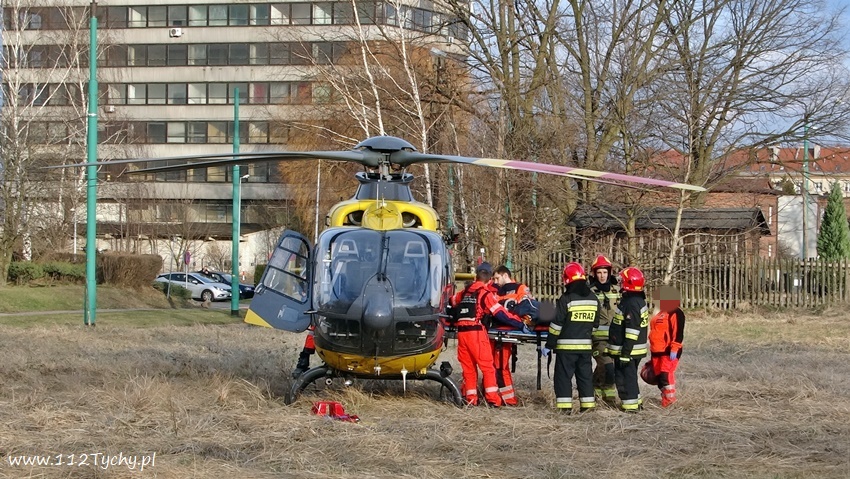 15 marca po godzinie 15.30 dyżurny SKKM PSP Tychy otrzymał zgłoszenie o mężczyźnie, który miał wpaść pod pociąg relacji Tychy Lodowisko – Katowice w rejonie gazowni – ulice Barbary i Budowlanych. Na miejsce zdarzenia natychmiast zadysponowane zostały zastępy JRG Tychy (GBA, GCBA, SCRt), ZRM i patrole Policji. Po przybyciu na miejsce zgłoszenie potwierdziło się. Z relacji maszynisty pociągu wynika, że mężczyzna miał specjalnie wejść pod nadjeżdżający skład. Maszynista widząc mężczyznę rozpoczął hamowanie awaryjne co spowodowało, że mężczyzna został potrącony, a nie przejechany. Ratownicy wydobyli mężczyznę spod pociągu z urazami nóg. Został on z miejsca zdarzenia przetransportowany na desce ortopedycznej do karetki. Decyzją pracujących na miejscu ratowników medycznych został podjęta decyzja o konieczności transportu mężczyzny do szpitala specjalistycznego. W tym celu na miejsce zdarzenia zadysponowana została latająca karetka – śmigłowiec HEMS – Ratownik 4 z bazy w Gliwicach. Strażacy zabezpieczyli lądowisko dla LPR – u na pobliskiej polanie. Na miejsce zdarzenia przybył także zastępca KM PSP Tychy. 45 – letni mężczyzna drogą lotniczą został przetransportowany do szpitala w Katowicach Ochojcu. Na miejsce zdarzenia wezwani zostali również funkcjonariusze SOK i tyskiej Straży Miejskiej, którzy wraz ze strażakami ewakuowali z pociągu około 40 pasażerów, którzy musieli zmienić swoje plany podróży. Na miejsce dodatkowo wezwany został policyjny technik kryminalistyki, który wykonał dokumentację z miejsca zdarzenia oraz zabezpieczył ślady. Ze wstępnych ustaleń pracujących na miejscu Policjantów wynika, że zdarzenie mogło być próbą samobójczą. Maszynista pociągu w chwili zdarzenia był trzeźwy. Dodatkowo na miejsce przybyli przedstawiciele państwowej komisji badania wypadków kolejowych. Działania na miejscu trwały blisko trzy godziny. Tyscy Policjanci prowadza dalsze postępowanie w sprawie tego zdarzenia.