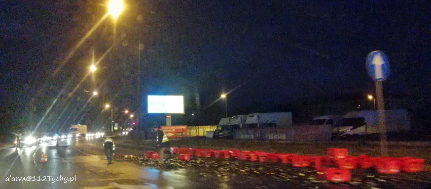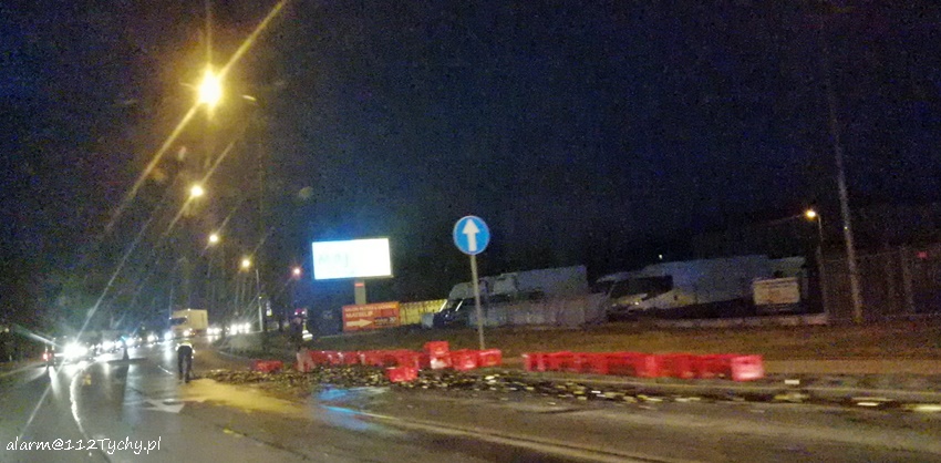 15 marca około godziny 18.30 dyżurny KMP Tychy otrzymał zgłoszenie o zdarzeniu drogowym z udziałem samochodu ciężarowego na ulicy Mikołowskiej w rejonie wjazdu do browaru. Ze zgłoszenia wynikało, ze z jadącego samochodu wysypały się skrzynki ze złocistym napojem. Na miejsce natychmiast zadysponowany został patrol Policji. Jeszcze przed przyjazdem patrolu Policji miejsce zdarzenia zabezpieczył pracownik jednej z tyskich pomocy drogowych. Przybyli na miejsce Policjanci w miejscu zdarzenia podjęli ręczną regulację ruchem wprowadzając ruch wahadłowy – niestety wielu kierowców nadal nie potrafi stosować się do poleceń wydawanych przez funkcjonariuszy. Kierowca pojazdu oraz wezwana na miejsce firma odpowiedzialna za utrzymanie dróg w Tychach przy użyciu mioteł i łopat usunęli potłuczone butelki z pasa drogowego. Utrudnienia w ruchu w miejscu zdarzenia trwały ponad godzinę. Najprawdopodobniej kierowca pojazdu źle zabezpieczył ładunek, który wypadł z pojazdu. Tyscy Policjanci prowadzą dalsze postępowanie w tej sprawie.