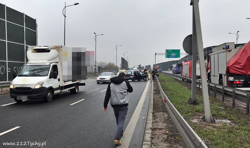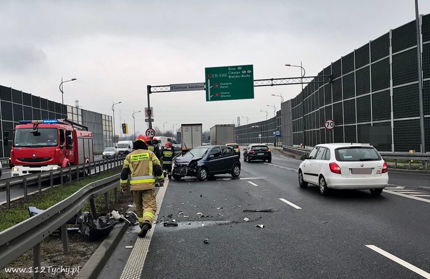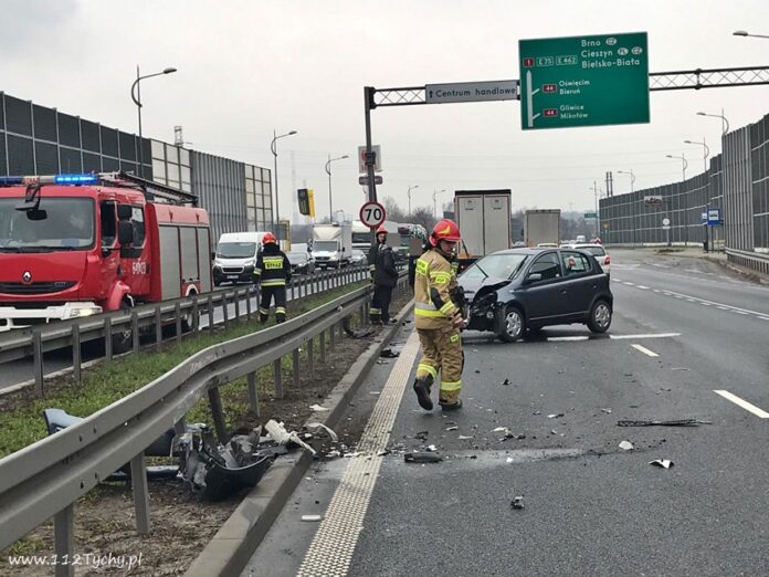 28 marca przed godziną 9 na ulicy Beskidzkiej (trasa DK 1) w rejonie skrzyżowania z ulicą Dzwonkową na pasie w kierunku Pszczyny doszło doz darzenia drogowego z udziałem samochodu osobowego Toyota i samochodu ciężarowego Volvo. Na miejsce zdarzenia zadysponowane zostały zastępy JRG Tychy (GBA, SCRt) oraz patrol Policji. W wyniku zdarzenia zablokowane zostały lewe pasy w obu kierunkach. Z ustaleń pracujących na miejscu Policjantów wynika, że winna zdarzenia jest kierująca Toyota kobieta, która włączając się do ruchu z ulicy Dzwonkowej najprawdopodobniej nie zachowała ostrożności podczas zmiany pasa ruchu i wjechała wprost pod ciężarowe Volvo, w wyniku czego została zepchnięta na bariery energochłonne. Na szczęście kierująca nie odniosła obrażeń. Uszkodzony pojazd został usunięty na pobliską zatokę autobusową, a strażacy uprzątnęli pas drogi z elementów rozbitego pojazdu oraz zneutralizowali plamę płynów eksploatacyjnych. Utrudnienia w ruchu w miejscu zdarzenia trwały około godziny. Za spowodowanie kolizji drogowej kierują Toyotą została ukarana mandatem karnym.