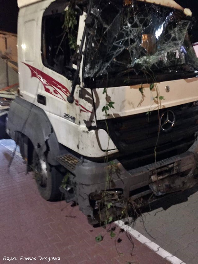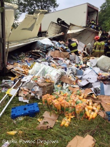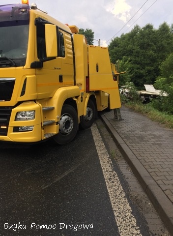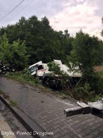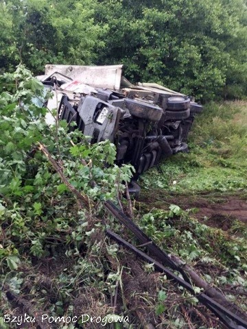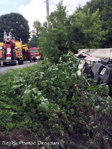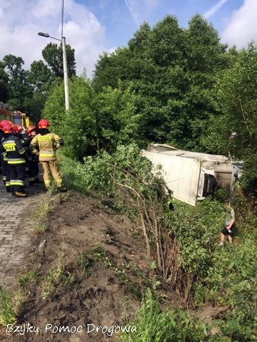 13 lipca po godzinie 15 dyżurny SKKM PSP Tychy otrzymał zgłoszenie o samochodzie ciężarowym w rowie na ulicy Chełmskiej. Na miejsce zdarzenia natychmiast zadysponowane zostały zastępy OSP Chełm Śląski (GBA, GLBARt), OSP Czarnuchowice (GBA), JRG Tychy (GBA, GCABRt, SCRt), zespół PRM i patrol Policji. Po przybyciu na miejsce ratownicy i strażacy zastali samochód ciężarowy marki Mercedes (chłodnia) leżący na boku poza drogą. Kierowca ciężarówki trafił pod opiekę ratowników medycznych – na szczęście nie doznał poważniejszych obrażeń i po pozostał na miejscu. W miejscu zdarzenia został wprowadzony ruch wahadłowy. Miejsce zdarzenia zostało zabezpieczone. Ze względu na uszkodzenie skrzyni ładunkowej przewoźnik na miejsce podstawił pojazd zastępczy, do którego został przeładowany ładunek – materiały spożywcze. Na miejsce zdarzenia wezwana została pomoc drogowa ciężkim holownikiem, przy użyciu którego pojazd został postawiony na koła, wyciągnięty z rowu, a następnie odholowany. Ze wstępnych ustaleń pracujących na miejscu Policjantów wynika, że przyczyną zdarzenia było niedostosowanie prędkości do warunków na drodze oraz przeładowanie pojazdu. Działania na miejscu jak i utrudnienia w ruchu trwały około 10 godzin. Dopiero około godziny 1 w nocy 14 lipca działania na miejscu zostały zakończone. Bieruńska Policja prowadzi dalsze postępowanie w sprawie tego zdarzenia.