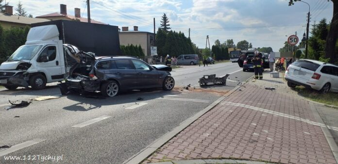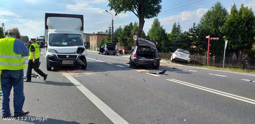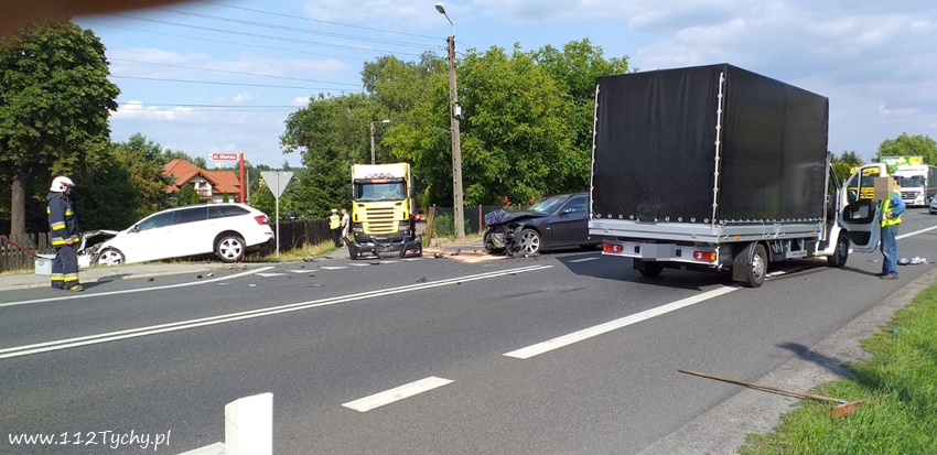 18 lipca po godzinie 16 na ulicy Gliwickiej (DK 44) w rejonie skrzyżowania z ulicą Polną w Mikołowie doszło do zderzenia trzech pojazdów. Na miejsce natychmiast zadysponowane zostały zastępy JRG Mikołów (GBA, SRt) i OSP Paniowy (GBA) oraz zespoły PRM i patrole mikołowskiej Policji. Ruch w miejscu zdarzenia został całkowicie zablokowany. Cztery osoby podróżujące pojazdami zostały poszkodowane, a wśród nich około 2 miesięczne dziecko. Z ustaleń pracujących na miejscu Policjantów wynika, że winnym zdarzenia jest kierowca dostawczego Fiata, którego kierowca z niewyjaśnionych przyczyn najechał na tył osobowego BMW, którego kierowca oczekiwał na możliwość wykonania manewru skrętu w lewo z ul. Gliwickiej w Polną. W wyniku uderzenia w tył BMW została przesunięte na przeciwległy pas gdzie zderzyło się ze Skoda. Skoda po uderzeniu zatrzymała się w przydrożnym rowie. Utrudnienia w ruchu w miejscu zdarzenia trwały ponad dwie godziny. Na czas działań Policja wyznaczyła objazdy. Mikołowscy Policjanci prowadzą dalsze postępowanie w sprawie tego zdarzenia.