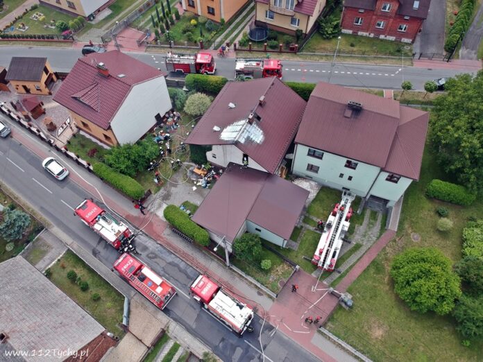 20 lipca około godziny 11:45 dyżurny SKKM PSP Tychy otrzymał zgłoszenie o pożarze dachu budynku jednorodzinnego w Bojszowach przy ulicy Jedlińskiej. Ze zgłoszenia wynikało, że na miejscu jest już patrol bieruńskiej Policji, a mieszkańcy opuścili budynek. Na miejsce natychmiast zadysponowane zostały zastępy OSP Bojszowy (GBA, GBA), OSP Bojszowy Nowe (GBA), JRG Tychy (GBA, GCBARt, SD) oraz OSP Bieruń Nowy (GCBA). Po przybyciu na miejsce zgłoszenie potwierdziło się, a strażacy zabezpieczyli miejsce zdarzenia i przystąpili do gaszenia. Podane zostały prądy wody wewnątrz budynku oraz z drabiny mechanicznej. Dodatkowo strażacy wykonali zabezpieczenie wodne z pobliskich hydrantów. Dodatkowo na miejsce zadysponowane zostało pogotowie energetyczne. Po kilkunastu minutach sytuacja została opanowana. Strażacy po opanowaniu ognia musieli opróżnić pomieszczenia ze spalonych elementów i dokładnie je przelać. Na czas działań gaśniczych ruch na ulicy Jedlińskiej w rejonie pożary został całkowicie wstrzymany. Na miejsce pożaru przyjechał również KM PSP Tychy st. bryg. Piotr Szojda (SOp) i przejął dowodzenia działaniami. Po około trzech godzinach działania na miejscu zostały zakończone. Na miejsce pożaru wezwany został również inspektor nadzoru budowlanego, który mieszkańcom przekazał informację na temat dalszego użytkowania budynku. Trwa ustalanie przyczyn i okoliczności powstania pożaru.