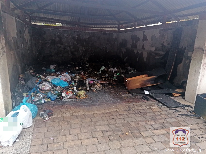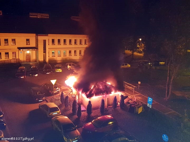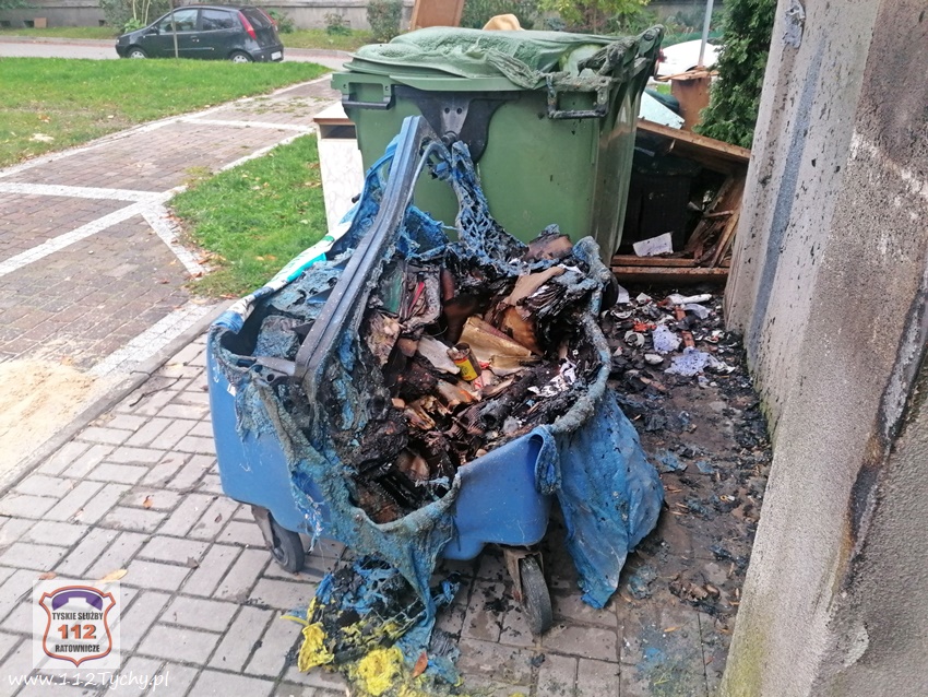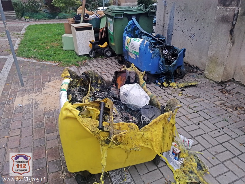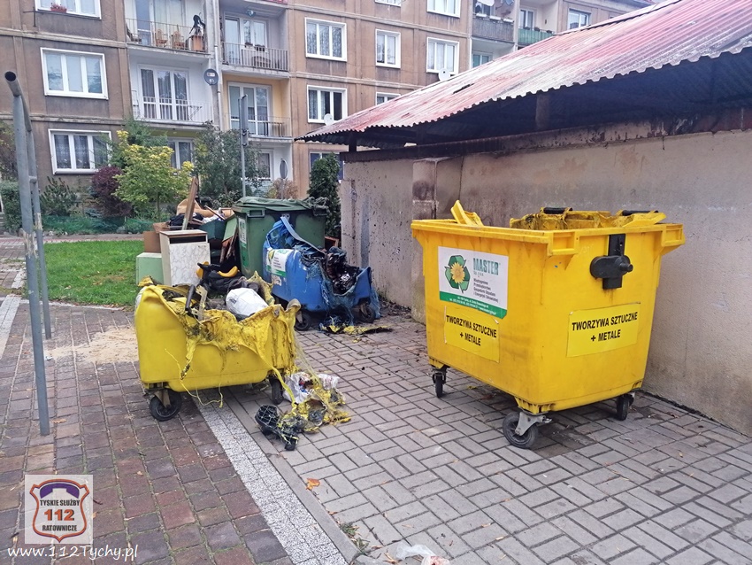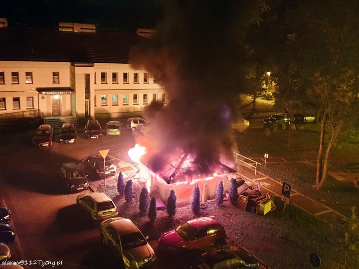 4 października około godziny 2 w nocy dyżurni SKKM PSPTychy oraz KMP Tychy otrzymali zgłoszenie o pożarze wiaty śmietnikowej przy ulicy Cienistej w rejonie przedszkola. Ze zgłoszenia wynikało, że zagrożone są zaparkowane w pobliżu pojazdy. Na miejsce natychmiast zadysponowany został zastęp JRG Tychy (GBA) oraz patrol Policji. Po dotarciu na miejsce zgłoszenie potwierdziło się. Spaleniu lub uszkodzeniu uległo 9 pojemników na odpady o pojemności 1100l oraz zaparkowany w pobliżu osobowy Opel (stopiony reflektor). Po ugaszeniu pożaru pogorzelisko zostało sprawdzone przez strażaków. Po około godzinie działania na miejscu zostały zakończone. Prawdopodobną przyczyną pożaru było podpalenie. Szkody w mieniu firmy, do której należały spalone pojemniki wynoszą około 4 tys. złotych.