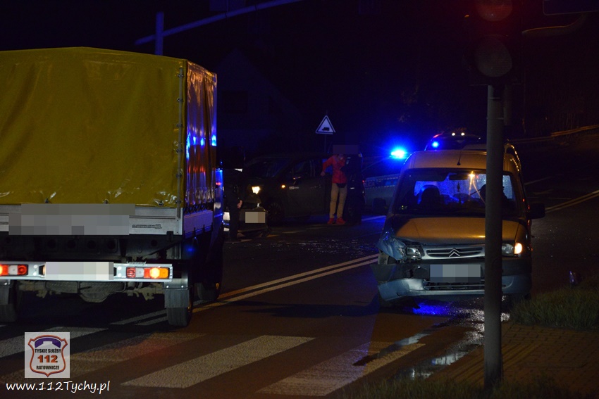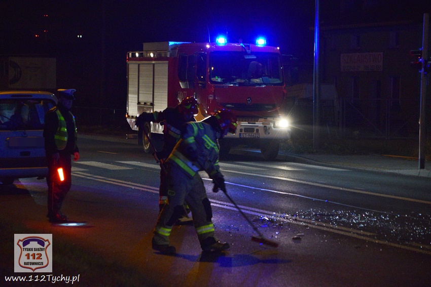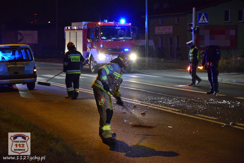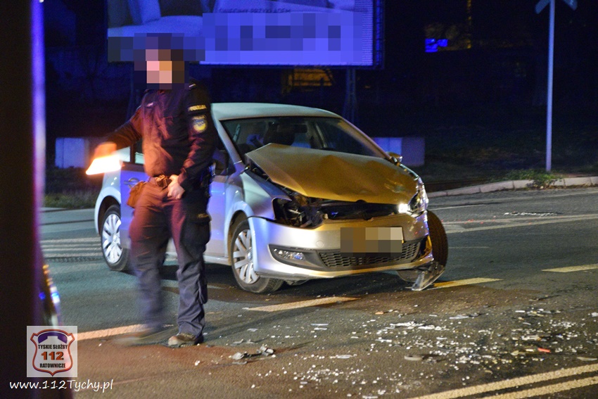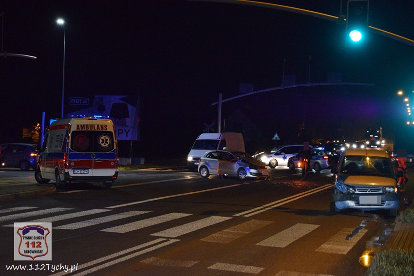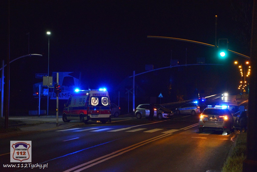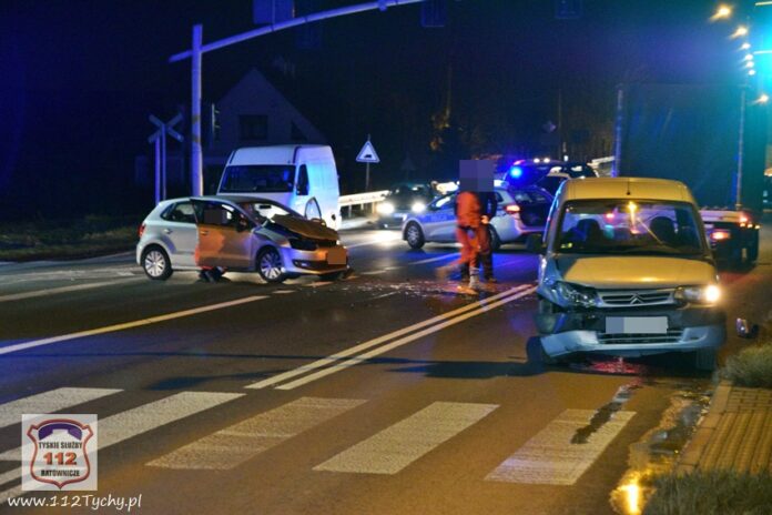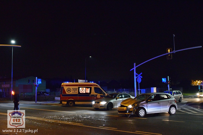 28 listopada około godziny 19:45 dyżurny KMP Tychy oraz dyspozytor WPR KAtowice – stacja Tychy otrzymali zgłoszenie o wypadku drogowym na ulicy Mikołowskiej w rejonie wiaduktu kolejowego. na miejsce zdarzenia natychmiast zadysponowany został zespół PRM oraz patrol Policji. Po dotarciu na miejsce okazało się, że do zdarzenia doszło na skrzyżowaniu ulic Mikołowskiej (DK 44) i Asnyka. W miejscu zdarzenia wprowadzona została ręczna regulacja ruchem przez przybyłych na miejsce Policjantów. W zdarzeniu brały udział dwa samochody osobowe: VW Polo oraz Citroen Berlingo. Uczestnicy zdarzenia trafili pod opiekę ratowników medycznych. Na szczęście nic poważnego im się nie stało. Z ustaleń pracujących na miejscu Policjantów wynika, że winną zdarzenia jest kobieta kierująca Citroenem. Jadąc ulicą Mikołowską w kierunku browaru nie zastosowała się ona do sygnalizacji świetlnej (czerwone światło dla jej kierunku ruchu) i doprowadziła do zderzenia z VW, który skręcał w lewo z ulicy Asnyka w Mikołowską (na zielonym świetle). Ze względu na wycieki płynów eksploatacyjnych z rozbitych pojazdów na miejsce zadysponowany został zastęp JRG Tychy (GBA). Strażacy szybko uprzątnęli jezdnię oraz pomogli w usunięciu wraków pojazdów z drogi. Za spowodowanie zdarzenia drogowego kierująca Citroenem została ukarana mandatem. Utrudnienia w ruchu w miejscu zdarzenia trwały ponad godzinę.