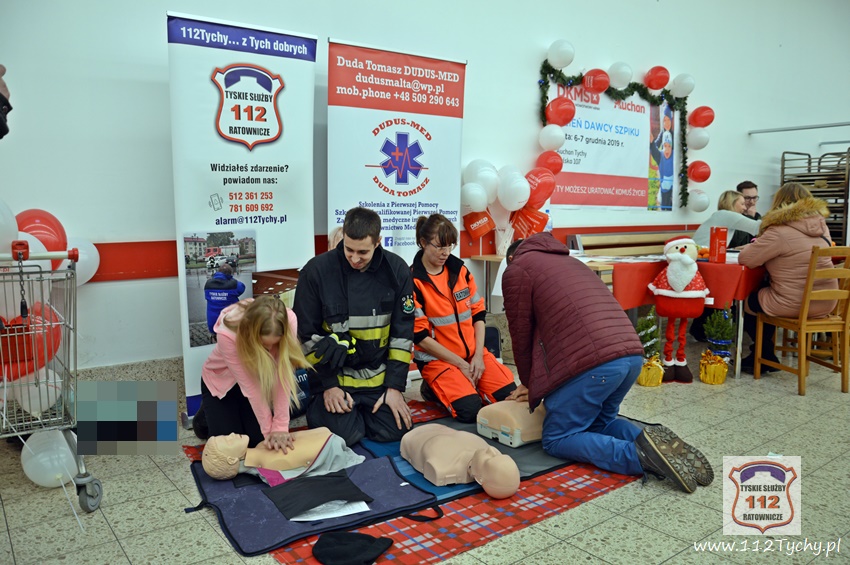 7 grudnia w ramach Mikołajkowych Dni Dawcy Szpiku na terenie tyskiego marketu Auchan odbyły się rejestracja potencjalnych dawców szpiku oraz pokazy w udzielaniu pierwszej pomocy przeprowadzone przez strażaków ratowników OSP Świerczyniec oraz firmy Dudus-MEd Tomasz Duda ze Świerczyńca. Podczas dwudniowej (6 i 7 grudnia) akcji rejestracyjnej zarejestrowało się ponad 40 osób. W dniu dzisiejszym przez około dwie godziny kilkanaście osób spróbowało swoich sił w prowadzeniu resuscytacji krążeniowo – oddechowej. Kolejna akcja rejestracji potencjalnych dawców oraz pokazy pierwszej pomocy najprawdopodobniej w maju 2020 r.