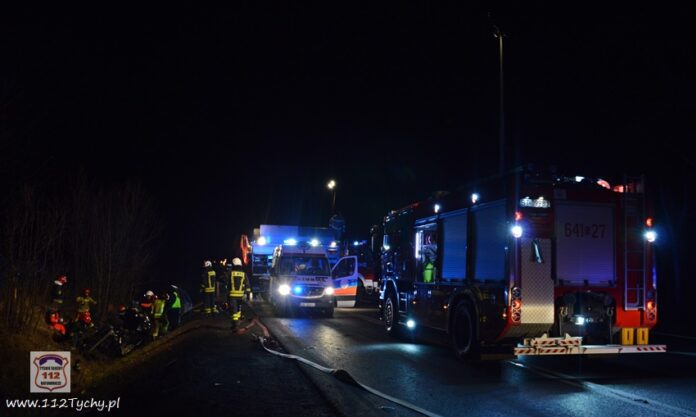 :28 stycznia około godziny 19:30 dyżurni SKKM PSP Tychy i KPP Bieruń otrzymali zgłoszenie o dachowaniu samochodu osobowego na ulicy Turyńskiej (DK 44) w Bieruniu. Ze zgłoszenia wynikało, że w samochodzie znajduje się zakleszczony mężczyzna, a do zdarzenia miało dojść w rejonie skrzyżowania z ul. Wylotową. Na miejsce natychmiast zadysponowane zostały zastępy OSP Bieruń Stary (GCBA), JRG Tychy (GBA, GCBARt, SCRt) oraz zespół PRM i patrol Policji. Po dotarciu służb ratunkowych zgłoszenie potwierdziło się. Na czas działań ratunkowych ruch w miejscu zdarzenia został całkowicie wstrzymany. Ruch kołowy dla samochodów osobowych został częściowo skierowany przez centrum Starego Bierunia. Strażacy przy użyciu sprzętu hydraulicznego przystąpili do wykonania dostępu do poszkodowanego mężczyzny, a następnie do jego wyciągnięcia z wraku pojazdu. Te czynności trwały blisko pół godziny. Ze względu na liczne obrażenia mężczyzny stwierdzone przez ratowników medycznych podczas prob jego wydobycia z wraku pojazdu została podjęta decyzja o konieczności wezwania na miejsce śmigłowca LPR – Ratownik 6 z bazy w podkrakowskich Balicach. Lądowisko dla latającej karetki zostało wyznaczone na miejscu gminnym przy ul. Chemików w Bieruniu (boisko piłkarskie). Celem zabezpieczenia lądowiska zadysponowane zostały zastępy OSP Bieruń Nowy (GBARt, SLRt). Kierowca osobówki w stanie ciężkim z licznymi obrażeniami został przetransportowany do szpitala specjalistycznego w Sosnowcu. Ze wstępnych ustaleń pracujących na miejscu Policjantów wynika, ze prawdopodobna przyczyną zdarzenia było niedostosowanie prędkości do panujących warunków atmosferycznych. W wyniku utraty panowania nad pojazdem (Citroen) kierowca wpadł w poślizg i wjechał do przydrożnego rowu gdzie koziołkował. Utrudnienia w ruchu w miejscu zdarzenia potrwają do późnych godzin nocnych. Bieruńscy Policjanci prowadzą postępowanie w sprawie tego wypadku.