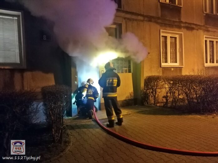 :4 marca około godziny 22:15 dyżurny SK KM PSP Tychy otrzymał zgłoszenie o pożarze w budynku wielorodzinnym przy ul. Czechowa. Na miejsce natychmiast zadysponowane zostały zastępy OSP Bieruń Nowy (GCBA) – z zabezpieczenia rejonu operacyjnego, JRG Tychy (GCBARt, SCD – 40,3), JRG 2 Katowice (GBA) oraz patrol Policji. Po dotarciu na miejsce zgłoszenie potwierdziło się. Nasz reporter, a zarazem strażak OSP Czarnuchowice wraz z druhami OSP Bieruń Nowy wyważył drzwi do klatki schodowej (brak zasilania domofonu) i sprawdził możliwość ewakuacji mieszkańców. Niestety nie było takiej możliwości ponieważ pożar zlokalizowany był przy wejściu do klatki schodowej i zejściu do piwnicy. Strażacy w aparatach ochrony układu oddechowego podali jeden prąd wody na źródło pożaru. Po kilku minutach pożar został opanowany i ugaszony. Kierujacy działaniem ratowniczym podjął decyzje o ewakuacji mieszkańców z budynku i dokładnym jego sprawdzeniu. Na miejsce działań wezwany został również patrol Policji oraz zespoły ratownictwa medycznego WPR katowice – stacja Tychy. Z bydunku ewakuowana 25 osób, w tym osoby starsze oraz kobietę z małym dzieckiem. Kobieta z dzieckiem znalazł schronienie w policyjnym radiowozie. W gotowości pozostawał autobus, który w razie potrzeby miał zostać podstawiony dla oczekujących na zakończenie działań lokatorów. Kilka osób zostało przebadanych przez ratowników medycznych. Ze wstępnych ustaleń wynika, że przyczyną pożaru było podpaleni skaldowanych na kaltce schodowej szmat i innych łatwopalnych materiałów. W wyniku pożaru spaleniu uległy drzwi do piwnicy oraz instalacja elektryczna. Dodatkowo na miejsce wezwani zostali przedstawiciele administratora budynku oraz pogotowie energetyczne. Na miejsce działań przyjechał również KM PSP Tychy, st. bryg. mgr.inż. Piotr Szojda (SOp). Po zakończeniu działań gaśniczych strażacy przewietrzyli i oddymili budynek, a następnie wykonali pomiary na obecność tlenku węgla. Na szczęście lokatorzy mogli wrócić do swoich domów. Działania na miejscu zdarzenia trwały ponad dwie godziny. Trwają dalsze czynności mające na celu dokładne wyjaśnienie przyczyn i okoliczności powstania pożaru. Na czas działań ratowniczo – gaśniczych zabezpieczenie rejonu pełnił zastęp OSP Bieruń Stary (GCBA)