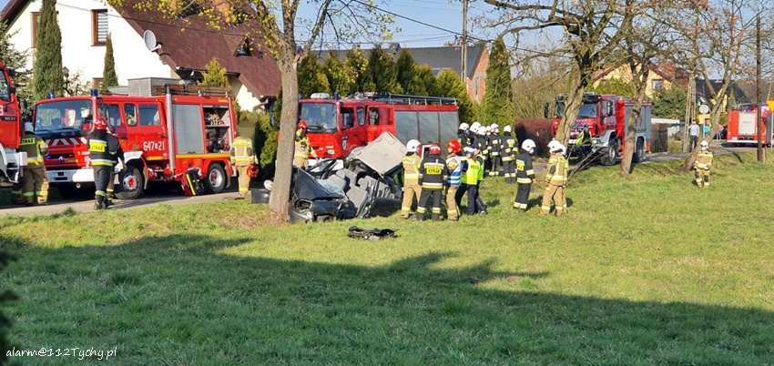 :11 kwietnia około godizny 16:30 dyżurni KPP Bieruń i SK KM PSP Tychy otrzymali zgłoszenie o wypadku drogowym na ul. Kasztanowej w Świerczyńcu. Ze zgłoszenia wynikało, że samochód osobowy marki Daewoo uderzył w przydrożne drzewo, a kierowca został zakleszczony we wraku. Na miejsce natychmiast zadysponowane zostały zastępy OSP Świerczyniec (GBA), OSP Bojszowy Nowe (GBA, GBA), JRG Tychy (GBA, SCRt) oraz zespół ratownictwa medycznego, a także patrol Policji. Ruch w miejscu zdarzenia został całkowicie wstrzymany. Po przybyciu na miejsce strażacy przy użyciu narzędzi hydraulicznych wykonali dostęp do poszkodowanego i wyciągnęli go z pojazdu. Mężczyzna trafił pod opiekę ratowników medycznych. Na miejsce został dodatkowo zadysponowany śmigłowiec LPR – Ratownik 4. Decyzją lekarza z latającej karetki mężczyzna został przetransportowany do szpitala w Katowicach Ochojcu drogą lądową. Ze wstępnych ustaleń pracujących na miejscu Policjantów, 33 – letni mężczyzna z niewyjaśnionych przyczyn stracił panowanie nad swoim pojazdem i uderzył w przydrożne drzewo. W szpitalu zostanie mu pobrana krew na obecność alkoholu lub innych środków. Działania na miejscu trwały około godziny. Bieruńscy Policjanci prowadzą postępowanie mające na celu wyjaśnienie przyczyn i okoliczności tego zdarzenia.