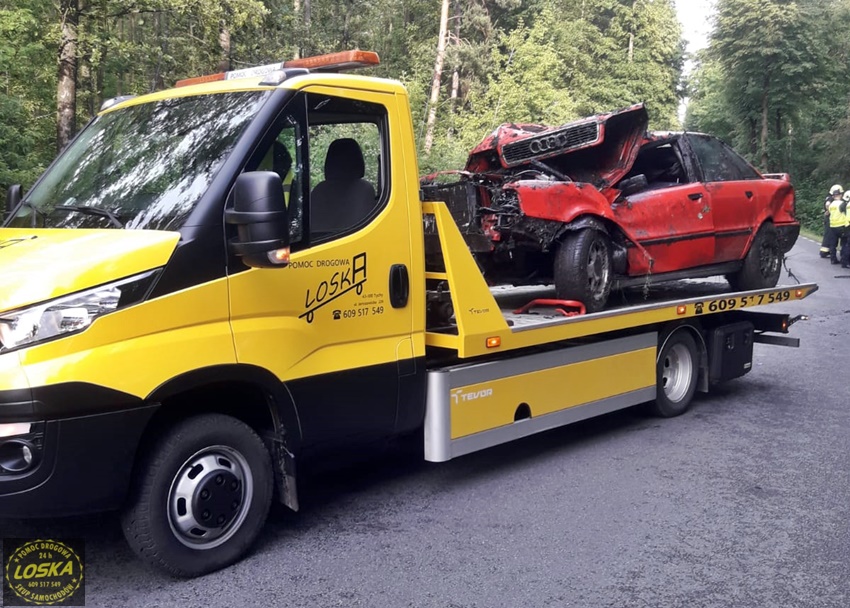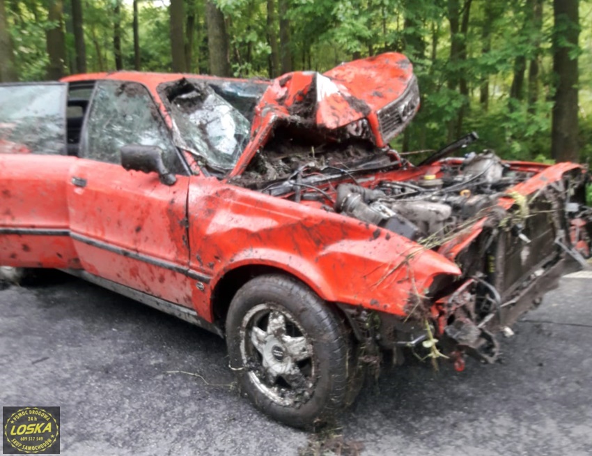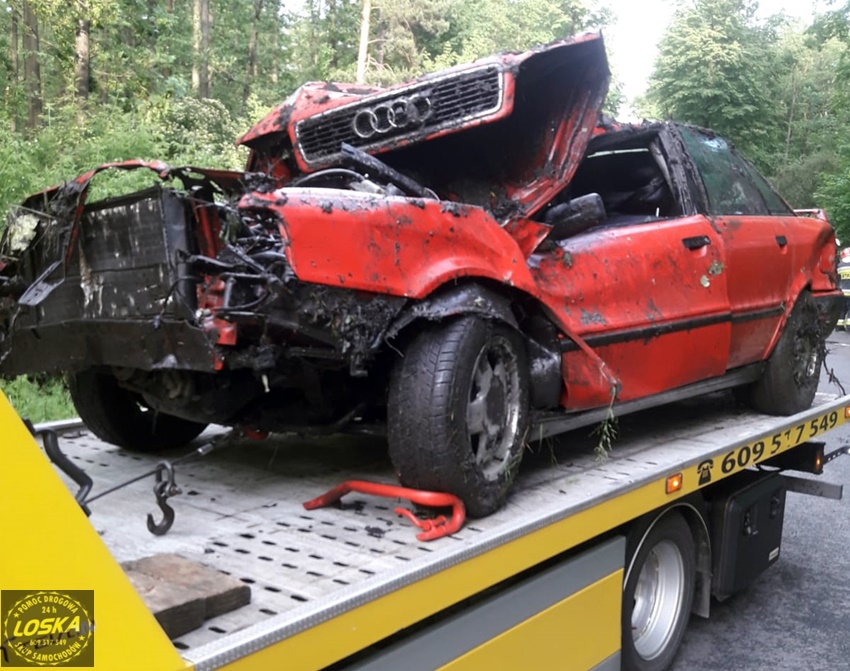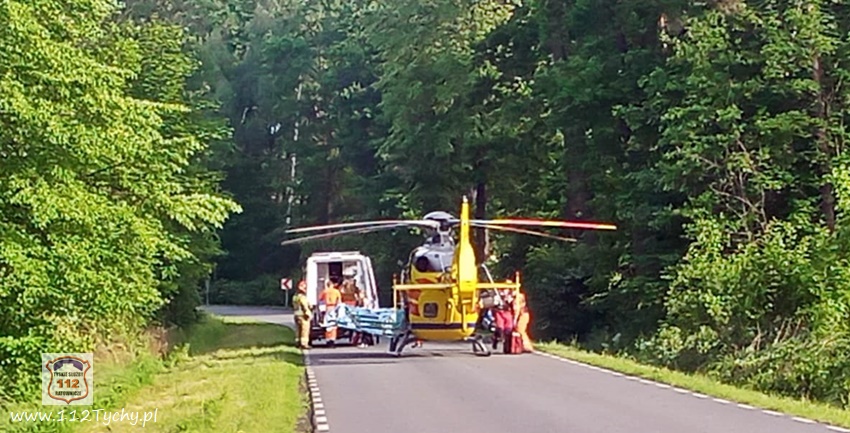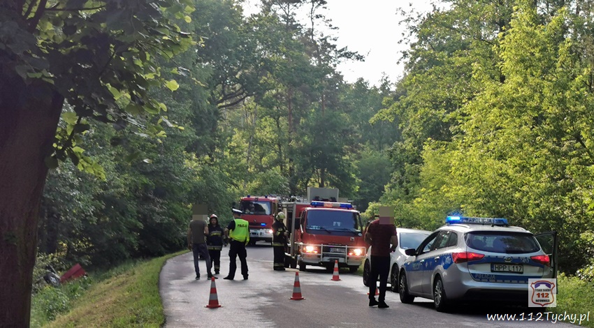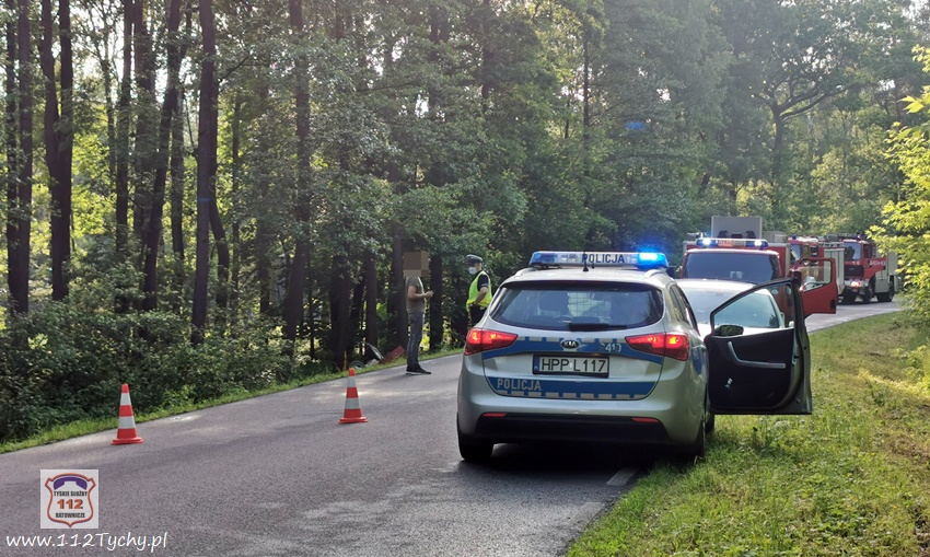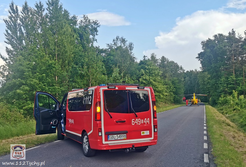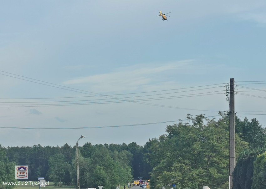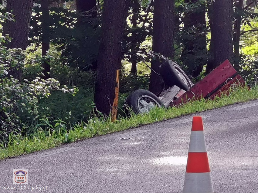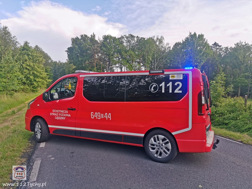 :7 czerwca po godzinie 17 dyżurny SK KM PSP Tychy otrzymał zgłoszenie o dachowaniu samochodu osobowego na ul. Jagiellońskiej w Lędzinach. Ze zgłoszenia wynikało, ze samochodem podróżowały dwie osoby (kobieta z dzieckiem). Na miejsce natychmiast zadysponowane zostały zastępy OSP Lędziny (GLBARt, SLRr), JRG Tychy (GBA, SCRt), zespół PRM, śmigłowiec LPR – Ratownik 4 oraz patrol Policji. Na czas działań ratowniczych ruch na ul. Jagiellońskiej został całkowicie wstrzymany. Po dotarciu na miejsce zgłoszenie potwierdziło się. Osobowe Audi na łuku drogi wypadło z drogi i dachowało w przydroznym rowie uderzając w pobliskie drzewa. Kierującej samochodem 26 – letniej kobiecie nic się nie stało, a podróżujące z nią około 4 – letnie dziecko (chłopiec) drogą lotniczą trafiło do szpitala w Katowicach Ligocie – ze wstępnych informacji wynika, że również nie doznało poważniejszych obrażeń (profilaktyczne badania). Z ustaleń pracujących na miejscu Policjantów wynika, że kierująca Audi kobieta nie dostosowała prędkości do panujących warunków drogowych i na śliskiej nawierzchni utraciła panowanie nad swoim pojazdem, co doprowadziło do zdarzenia drogowego. Zdarzenie zostało zakwalifikowane jako kolizja. Po ponad godzinie wrak został wydobyty z rowu i odholowany przez pomoc drogową. Po uprzątnięciu jezdni ruch został przywrócony.