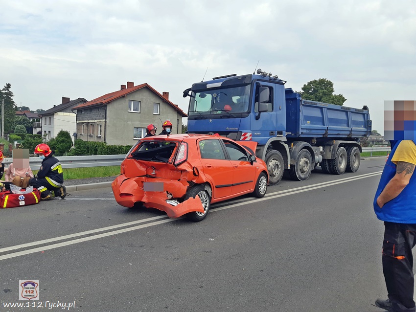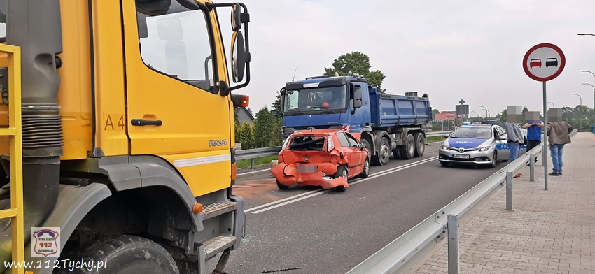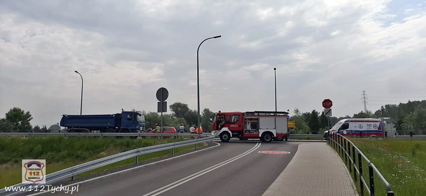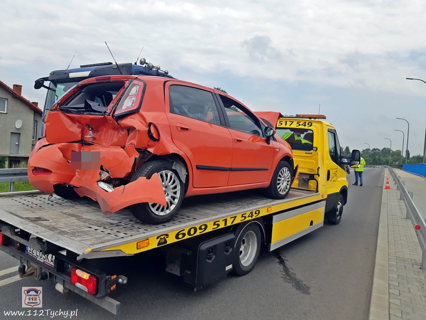 :12 czerwca około godziny 10 na skrzyżowaniu ul. Grota Roweckiego – Starokościelna doszło do zdarzenia drogowego z udziałem trzech pojazdów. Dwóch ciężarówkę marki Mercedes oraz osobowego Fiata. Na miejsce zdarzenia zadysponowane zostały zastępy JRG tychy (GBA, SCRt), patrol Policji oraz ZRM. Ruch na czas działań został całkowicie zablokowany. Z ustaleń pracujących na miejscu Policjantów wynika, że winnym zdarzenia jest kierowca jednej z ciężarówek, który najprawdopodobniej zagapił się i uderzył w tył oczekującego na możliwość skrętu w lewo z ul. Grota Roweckiego w ul. Starokościelną Fiata. Fiat uderzony w tył zjechał na przeciwległy pas i uderzył czołowo w kolejną ciężarówkę. kierująca Fiatem kobieta trafiła pod opiekę ratowników medycznych. Jednak po przebadaniu pozostała na miejscu zdarzenia. Rozbita osobówka została odholowana przez pomoc drogową. Po około godzinie ruch w miejscu zdarzenia został przywrócony. Policjanci KMP tychy prowadzą dalsze postępowanie w sprawie tego zdarzenia.