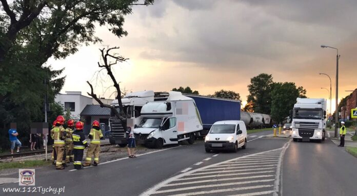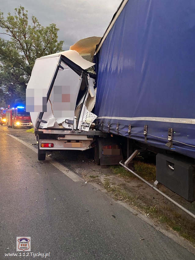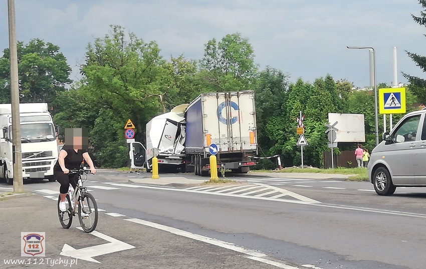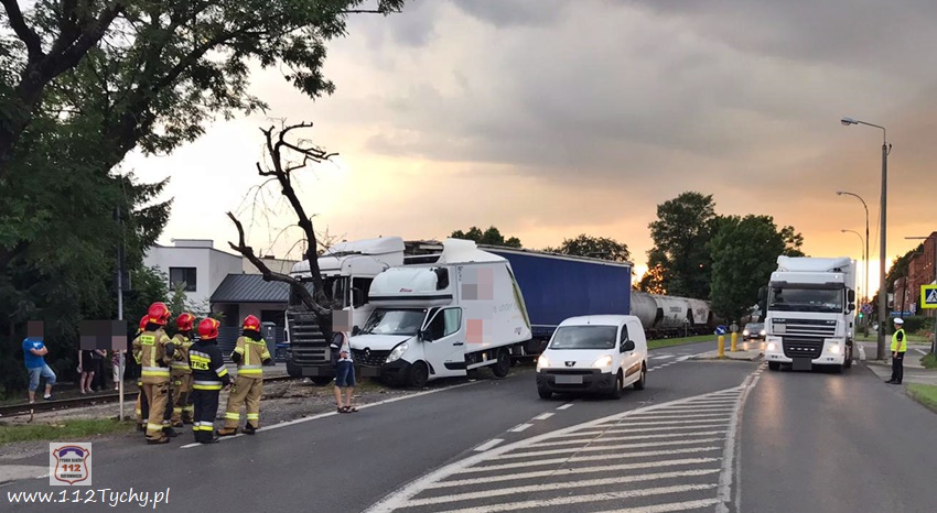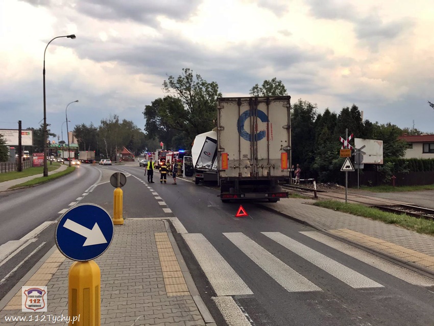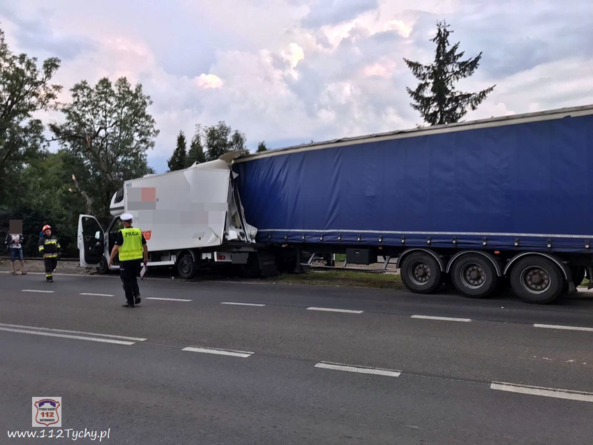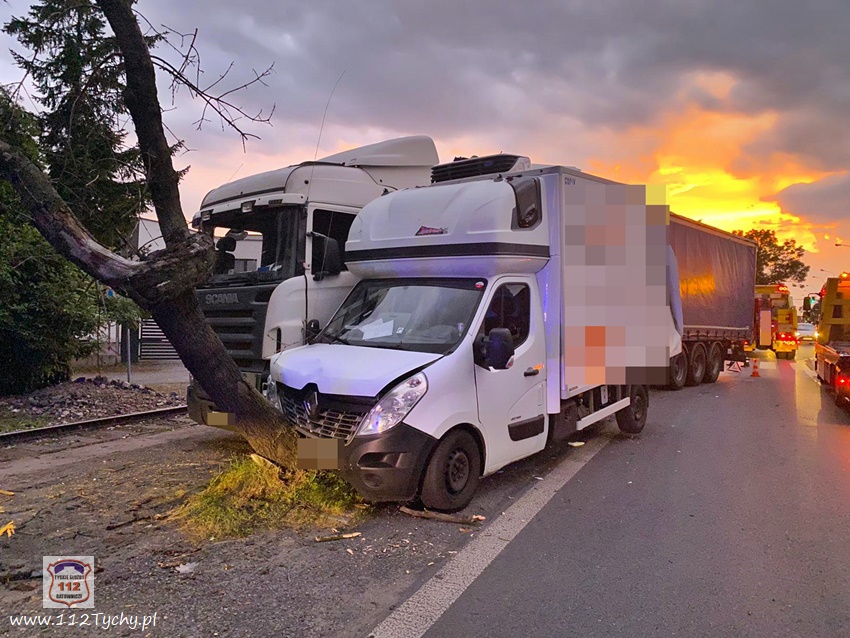 :24 lipca około godziny 19:20 na ul. Mikołowskiej tuż przed zjazdem do bramy towarowej tyskiego browaru w kierunku skrzyżowania z ul. Katowicką doszło do zdarzenia drogowego z udziałem samochodu dostawczego renault oraz ciągnika siodłowego Scania z naczepą. W wyniku zdarzenia dostawczy uderzył jeszcze w przydrożne drzewo, a ciagnik siodłowy wjechał na tory kolejowe prowadzące do browaru, którymi akurat poruszał się pociąg towarowy. Na miejsce zdarzenia wezwane zostały patrole Policji oraz zastępy JRG Tychy (GBA, GCBARt, SCRt). Ruch w kierunku skrzyżowania z ul. Katowicką został zablokowany. Po kilkunastu minutach wprowadzono ruch wahadłowy. Z ustaleń pracujących na miejscu Policjantów wynika, że winnym zdarzenia jest kierowca dostawczego Renaulta, który nie zachował ostrożności przy zmianie pasa z lewego na prawy i wjechał wprost pod ciagnik siodłowy. Przed godzina 22 uszkodzone pojazdy zostały odholowane przez pomoc drogową, a ruch został przywrócony. Policjanci KMP Tychy prowadzą dalsze postępowanie w sprawie tego zdarzenia.
