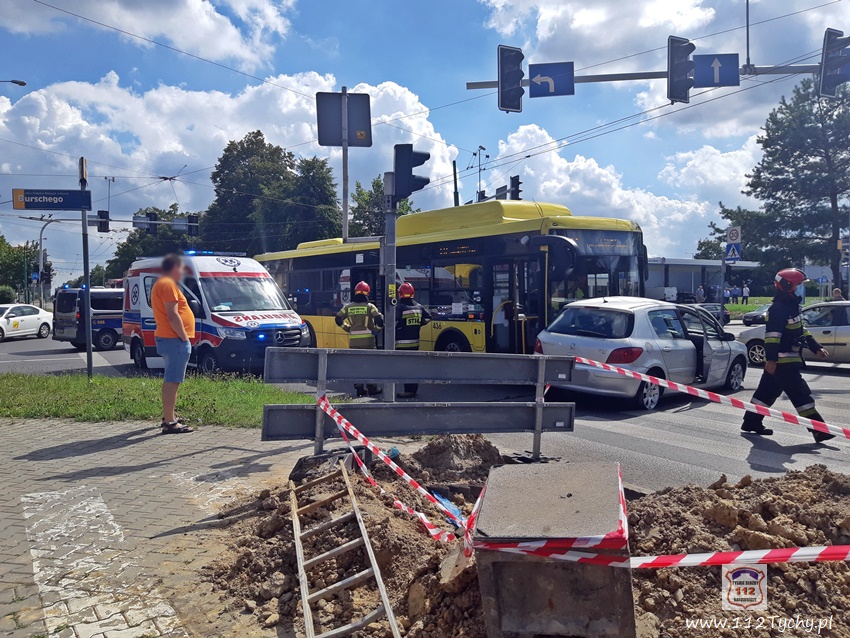 :25 sierpnia po godzinie 12:30 dyżurni KMP Tychy i SK KM PSP Tychy otrzymali zgłoszenie o zderzeniu autobusu komunikacji miejskiej z samochodem osobowym na skrzyżowaniu ul. Burschego – Budowlanych – Glinczańska. Ze zgłoszenia wynikało, że doszło do czołowo – bocznego zderzenia pojazdów. Na miejsce natychmiast zadysponowane zostały zastępy JRG Tychy (GBA, GBA, GCBARt, SCRt, SLRr), ZRM i patrole Policji. . Po dotarciu służb na miejsce zgłoszenie potwierdziło się. Dodatkowo na miejscu działał patrol Straży Miejskiej, który pomógł w zabezpieczeniu miejsca zdarzenia. Kierowca osobowego Peugeota trafił pod opiekę ratowników medycznych. Kierowcy autobusu nic się nie stało. Na szczęście nie było w nim pasażerów. Ze wstępnych ustaleń pracujących na miejscu Policjantów wynika, że kierowca osobowego Peugeota wjechał na skrzyżowanie z ul. Burschego wprost pod jadący ul. Budowlanych w kierunku dworca PKP autobus komunikacji miejskiej. Osobówka po uderzeniu została przepchnięta przez autobus kilkanaście metrów. Po wykonaniu dokumentacji pojazdy zostały usunięte ze skrzyżowania. Po około czterdziestu minutach ruch został przywrócony. Przypominamy, że na skrzyżowaniu nie działa sygnalizacja świetlna w związku z modernizacjją i budowa systemu ITS na terenie tychów. Droga z pierwszeństwem jest ul. Budowlanych. Policjanci KMP Tychy prowadzą dalsze postępowanie w sprawie tego zdarzenia.