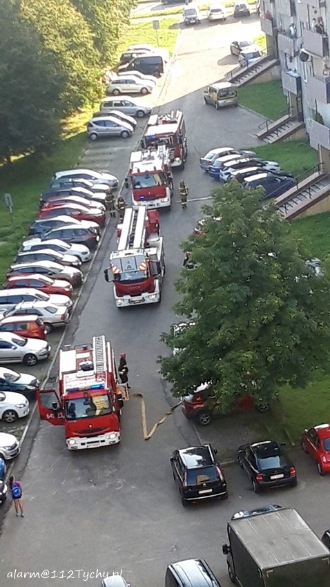 :15 września po godzinie 16 dyżurny SK KM PSP Tychy otrzymał zgłoszenie o zadymieniu w budynku wielorodzinnym przy al. Piłsudskiego 41. Na miejsce zadysponowany został pluton gaśniczy JRG Tychy (GBA, GBA, GCBARt, SCD – 40,3) oraz patrol Policji. Po dotarciu na miejsce i rozpoznaniu sytuacji okazało się, że przyczyną zadymienia jest przypalona potrawa w jednym z mieszkań. Strażacy oddymili całą klatkę schodową. Po około czterdziestu minutach działania zostały zakończone.