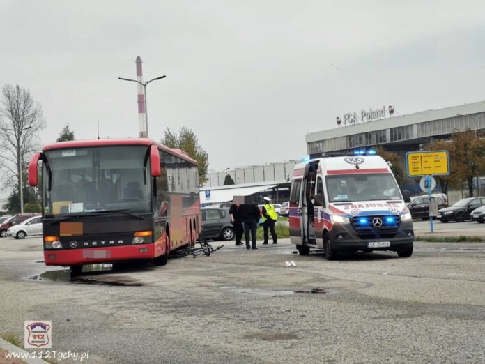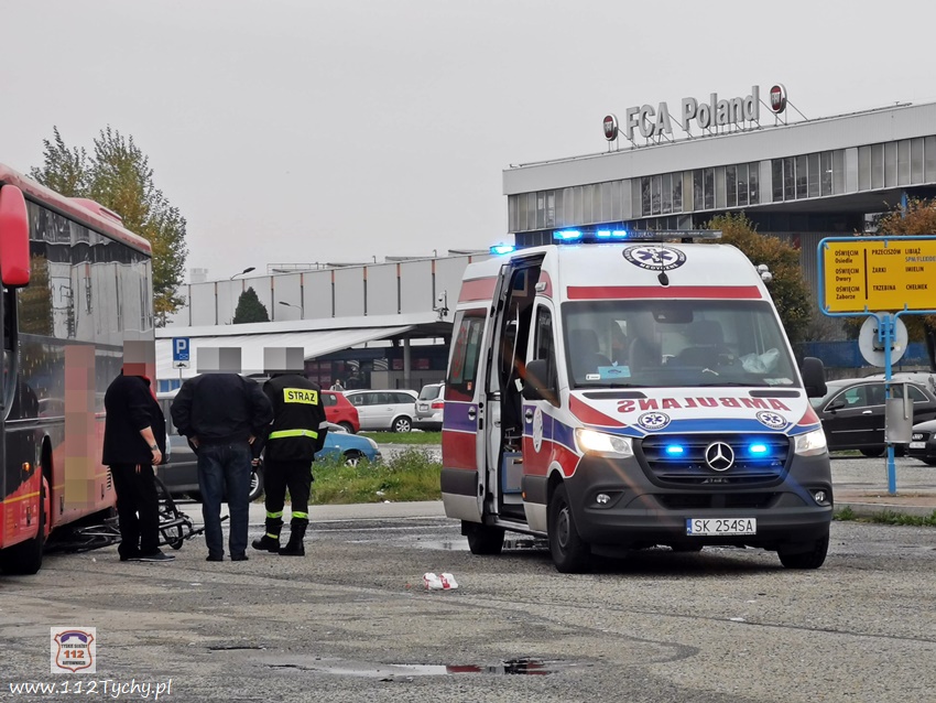 24 października około godziny 14:30 na placu autobusowym przy FCA na ul. Turyńskiej doszło do potrącenia rowerzysty przez autobus pracowniczy. Na miejsce zdarzenia zadysponowany został ZRM, patrole Policji z KPP Bieruń i KMP Tychy oraz pracownicy ZSR „SIRIO”. Poszkodowany rowerzysta trafił pod opiekę ratowników medycznych. W miejscu zdarzenia występowały utrudnienia w ruchu. Policjanci KMP Tychy prowadzą dalsze postępowanie w sprawie tego zdarzenia.