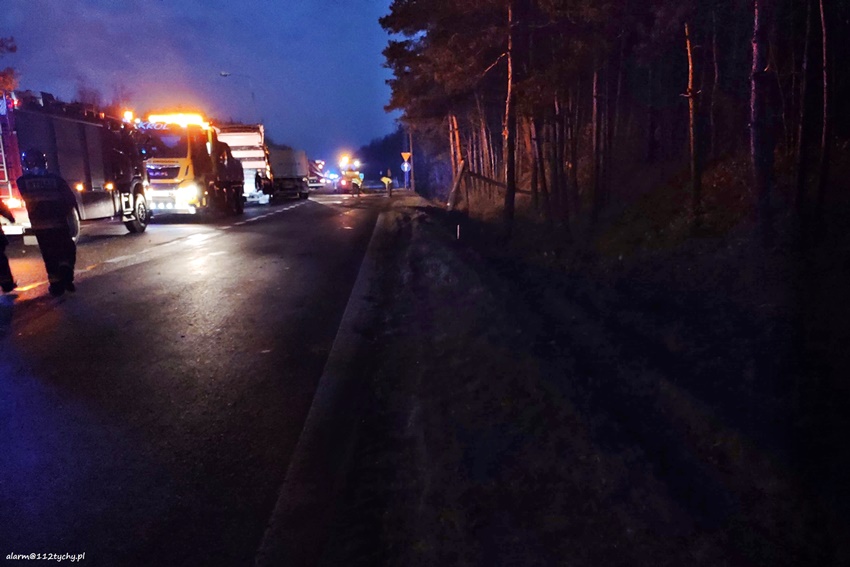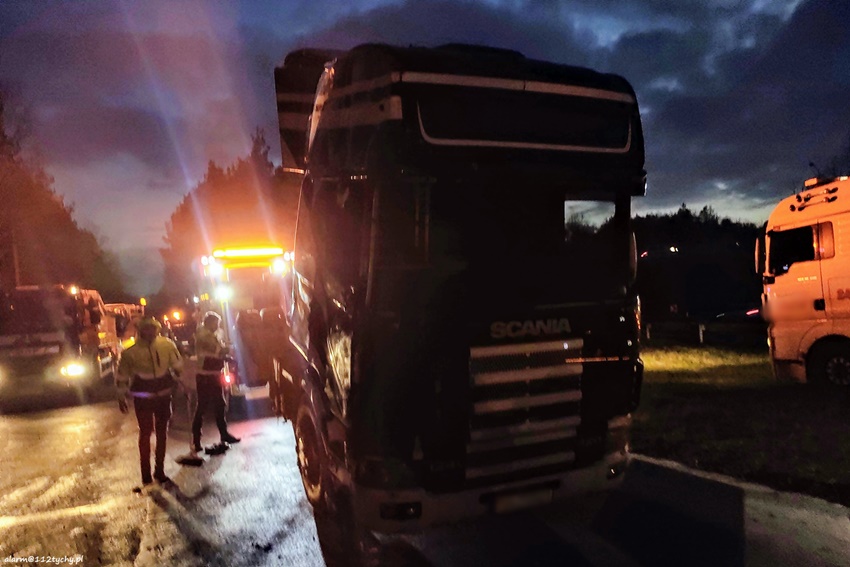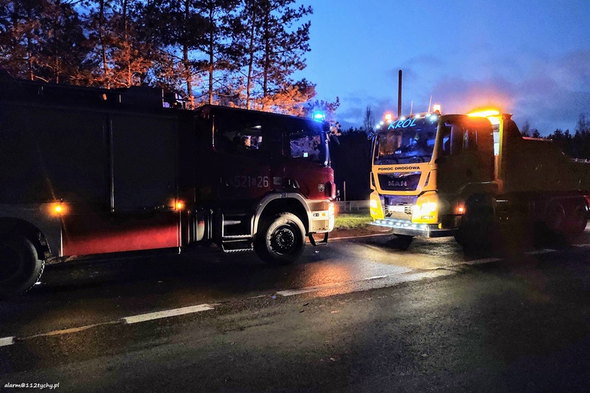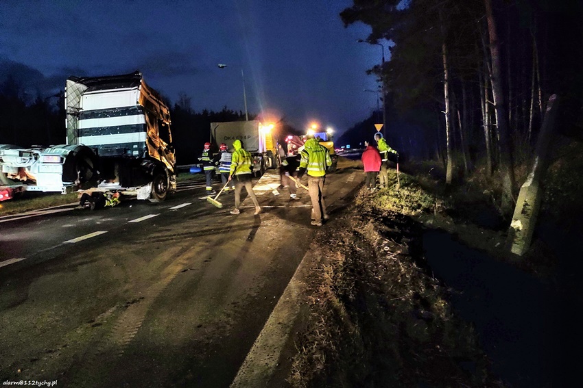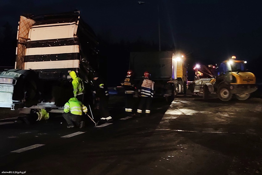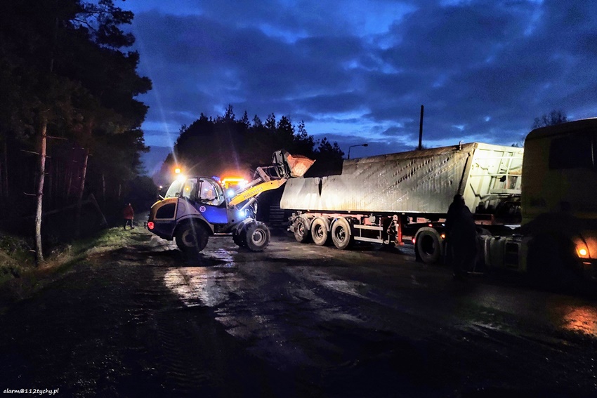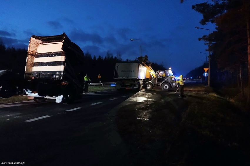 23 listopada po godzinie 14 na zjeździe z DW 934 na trasę S1 na pograniczu Imielina i Mysłowic doszło do zdarzenia drogowego z udziałem ciągnika siodłowego Scania z naczepą. Z niewyjaśnionych przyczyn zestaw wjechał do rowu, a następnie przewrócił się blokując drogę. Z naczepy wysypał się ładunek (żwir). Na miejsce natychmiast zadysponowane zostały zastępy JRG Mysłowice, OSP Kosztowy oraz patrole Policji. Kierowcy zestawu nic się nie stało. W wyniku zdarzenia uszkodzona została również infrastruktura drogowa i latarnia uliczna. Dodatkowo na miejsce wezwane zostało pogotowie energetyczne. Celem postawieniu zestawu na koła na miejsce wezwana została pomoc drogowa dysponująca ciężkim samochodem ratownictwa drogowego. Po około dwóch godzinach zestaw stał już na swoich kołach. Na miejsce dojechał ciężki sprzęt, którego zadaniem było ponowne załadowanie wysypanego ładunku na naczepę. Po załadunku droga został oczyszczona przez służby drogowe. Uszkodzony ciągnik siodłowy został odholowany. Mysłowiccy Policjanci prowadzą dalsze postępowanie mające na celu wyjaśnienie przyczyn i okoliczności tego zdarzenia.