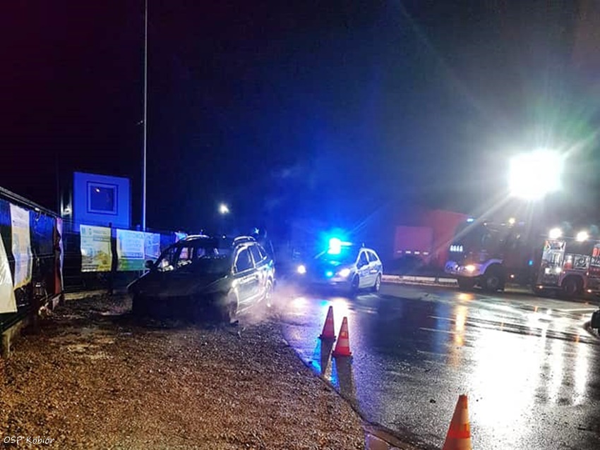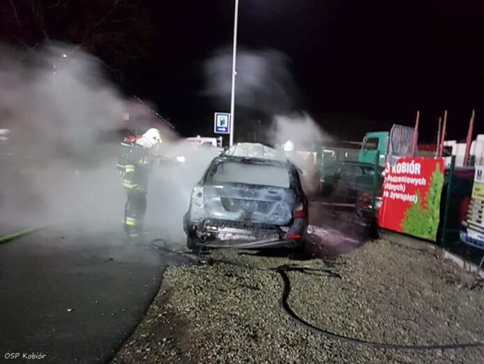 23 listopada po godzinie 18:35 dyżurny SK KP PSP Pszczyna otrzymał zgłoszenie o pożarze samochodu osobowego na ul. Leśnej w Kobiórze. Na miejsce natychmiast zadysponowane zostały zastępy OSP Kobiór (GBARt, GLB), JRG Pszczyna (GBA) oraz patrol Policji (KPP Pszczyna). Po przybyciu na miejsce strażacy zastali samochód osobowy Skoda całkowicie objęty pożarem. Strażacy w aparatach ochrony układu oddechowego przystąpili do działań. Niestety pomimo wysiłków strażaków pojazd spłonął niemal doszczętnie. Po około godzinie działania zostały zakończone. Trwa ustalanie przyczyn i okoliczności powstania pożaru