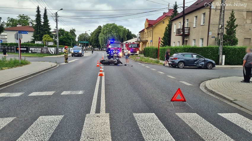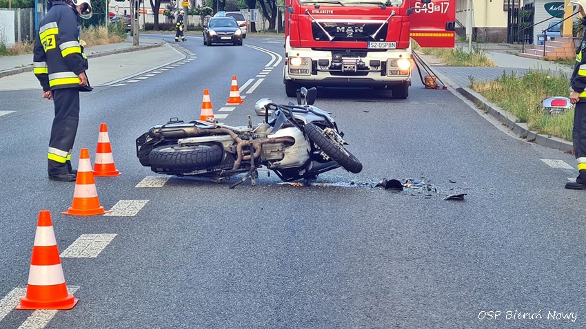 10 lipca około godziny 5:35 dyżurny SK KM PSP Tychy otrzymał zgłoszenie o zdarzeniu drogowym z udziałem samochodu osobowego i motocyklisty na skrzyżowaniu ul. Wawelska – Remizowa w Bieruniu. Na miejsce zadysponowane zostały: zespół PRM, zastępy OSP Bieruń Nowy (GBARt), JRG Tychy (GCBA, SCRt) oraz patrole Policji KPP Bieruń. Na czas działań ratunkowych ruch w miejscu zdarzenia został wstrzymany. Kierujący motocyklem z obrażeniami ciała (złamana noga) trafił pod opiekę ratowników medycznych, a następnie został przetransportowany do szpitala. Ze wstępnych ustaleń pracujących na miejscu Policjantów wynika, że sprawcą zdarzenia jest kierowca osobowego Seat-a, który wyjeżdżając z ul. Remizowej nie zatrzymał się przy znaku STOP i nie ustąpił pierwszeństwa przejazdu jadącemu w kierunku skrzyżowania z ul. Warszawską motocykliście. Utrudnienia w ruchu trwały blisko dwie godziny. Policjanci KPP Bieruń prowadzą dalsze postępowanie w sprawie tego zdarzenia.