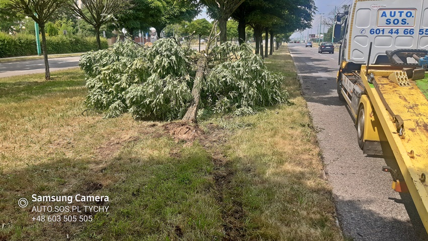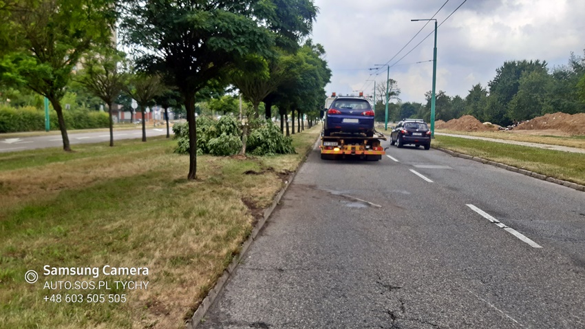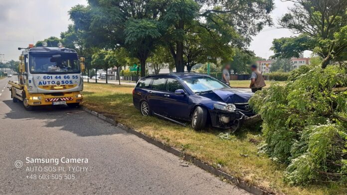 16 lipca przed godziną 12 na al. Jana Pawła II w rejonie budynku byłej Telekomunikacji na pasie w keirunku Hotelu Tychy doszło do groźnie wyglądającego zdarzenia drogowego. Na prostym odcinku drogi kierowca osobowej Hondy zjechał na pas zieleni i uderzył w przydrożne drzewo. Na miejsce zdarzenia przybył patrol Policji oraz holownik pomocy drogowej. Z ustaleń pracujących na miejscu Policjantów wynika, ze do zdarzenia doszło w wyniku awarii technicznej osobówki (wahacz). W wyniku tej awarii kierowca utracił panowanie nad pojazdem i uderzył w drzewo. Utrudnienia w ruchu trwały około godziny.