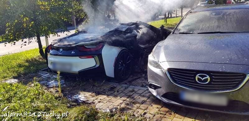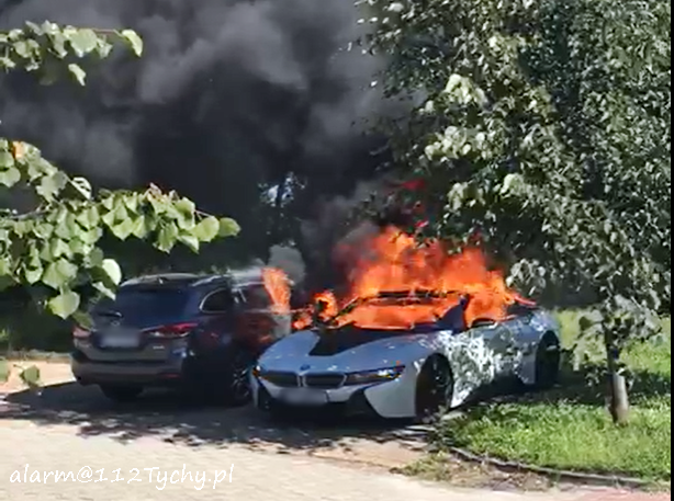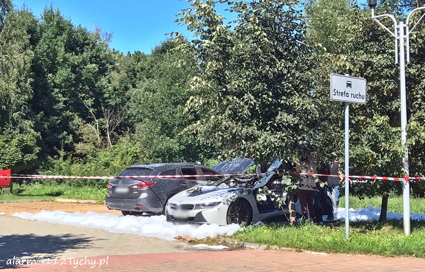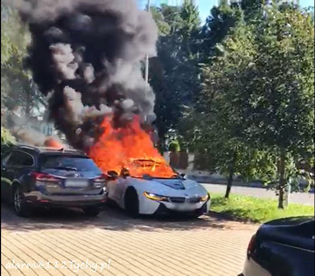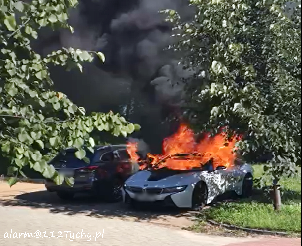 6 września około godziny 9:30 dyżurny SK KM PSP Tychy otrzymał zgłoszenie o pożarze dwóch samochodów osobowych na osiedlowym parkingu przy ul. Trzy Stawy. NA miejsce zgłoszenia zadysponowane zostały zastępy JRG Tychy (GBA, GCBARt) oraz patrol Policji. Po dotarciu na miejsce strażacy zastali objęte pożarem BMW i8 oraz Mazdę 6. Podane zostały prądy piany na płonące pojazdy. Po kilkunastu minutach pożar został ugaszony. Trwa ustalanie czy pożar był spowodowany zwarciem instalacji w BMW czy może doszło do podpalenia pojazdu. Policjanci KMP Tychy prowadzą w tej sprawie dalsze postępowanie.