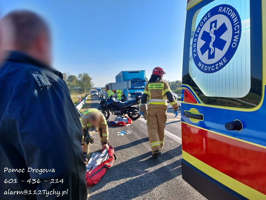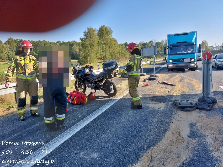 5 października po godzinie 9:30 dyżurny SK KM PSP Tychy otrzymał zgłoszenie o wypadku motocyklisty na trasie S1 przed wjazdem na trasę DK 86/ DK 1. Na miejsce zgłoszenia zadysponowane zostały zastępy JRG Tychy (GBA, SCRt), zespół PRM oraz patrol Policji. Przed przyjazdem służb ratunkowych na miejsce, z pomocą motocykliście pospieszyli świadkowie zdarzenia. Po dotarciu na miejsce okazało się, że motocyklista utracił panowanie nad swoim jednośladem i uderzył w bariery oraz znaki w rejonie prac drogowych. Motocyklista trafił pod opiekę ratowników medycznych, a następnie został przewieziony do szpitala na dokładną diagnostykę. W rejonie zdarzenia występowały utrudnienia w ruchu. Ze wstępnych ustaleń pracujących na miejscu Policjantów przyczyną zdarzenia było niedostosowanie prędkości. Policjanci KMP Tychy prowadza dalsze postepowanie w sprawie tego zdarzenia.