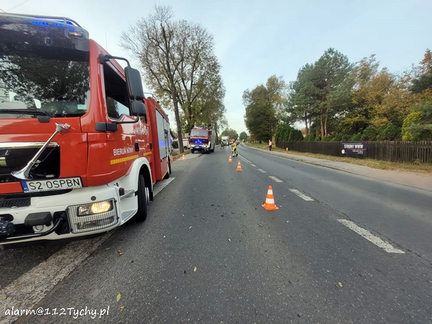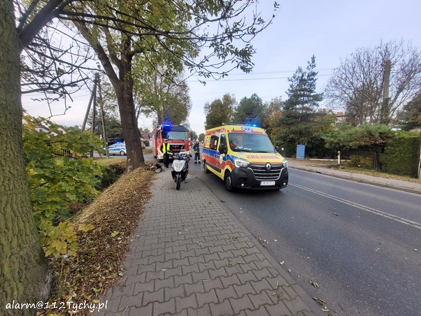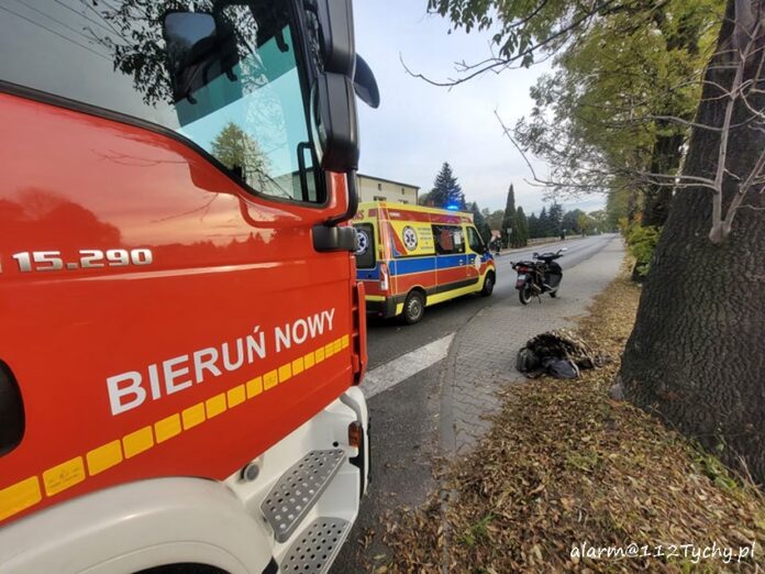 20 października około godziny 8 na ul. Wawelskiej przy skrzyżowaniu z ul. Boh. Westerplatte w Bieruniu doszło do zdarzenia drogowego. Na miejsce zdarzenia zadysponowane zostały zastępy OSP Bieruń Nowy (GBARt), JRG Tychy (GBA, SCRt), ZRM oraz patrol Policji. Na czas działań ratunkowych w miejscu zdarzenia wprowadzony został ruch wahadłowy. Ze wstępnych ustaleń pracujących na miejscu Policjantów wynika, że z ul. Boh. Westerplatte w ul. Wawelską włączał się do ruchu samochód osobowy, a jadący ul. Wawelską kierujący skuterem mężczyzna (ok. 70 lat) utracił panowanie nad swoim jednośladem i przewrócił się. W wyniku wywrotki mężczyzna doznał urazu głowy (rozcięty łuk brwiowy) i urazu kończyny dolnej. Poszkodowany został przetransportowany do szpitala w Tychach celem dalszej diagnostyki. Kierowca osobówki najprawdopodobniej nie zauważył, że kierowca jednośladu przewrócił się i odjechał z miejsca zdarzenia. Policjanci KPP Bieruń prowadzą dalsze postępowanie w tej sprawie.