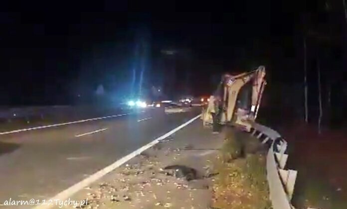 21 października około godziny 18:30 dyżurni SK KM PSP Tychy i KMP Tychy otrzymali zgłoszenie o zdarzeniu drogowym na 570km trasy S1 w kierunku Lędzin. Ze zgłoszenia wynikało, że doszło do zderzenia samochodu osobowego i koparko – ładowarki. Na miejsce zdarzenia zadysponowane zostały zastępy JRG Tychy (GBA, GCBARt, SCRt), ZRM oraz patrol WRD KMP Tychy. Po przybyciu na miejsce zgłoszenie zostało potwierdzone. Z pomocą kierowcy osobówki ruszyli świadkowie zdarzenia, którzy również ugasili palący się pojazd. Na czas działań ratunkowych ruch na trasie został zablokowany. Kierowca osobówki trafił pod opiekę ratowników medycznych. Na szczęście jego obrażenia nie były poważne i pozostał na miejscu. Ze względu na miejsce zdarzenia do jego obsługi wezwany został patrol WRD KMP Katowice. Pracujący na miejscu Policjanci uznali winnym zdarzenia kierowcę koparko – ładowarki, która wg przepisów nie powinna w ogóle się tą trasą poruszać. Utrudnienia w ruchu w miejscu zdarzenia trwały blisko dwie godziny.