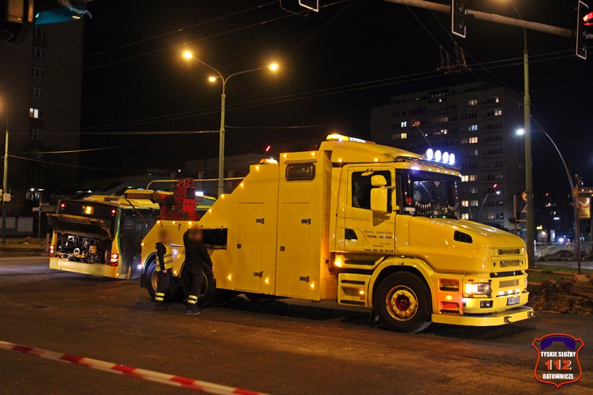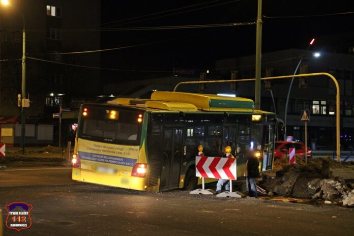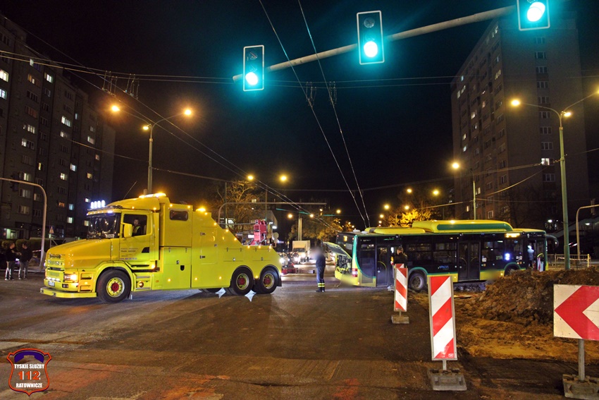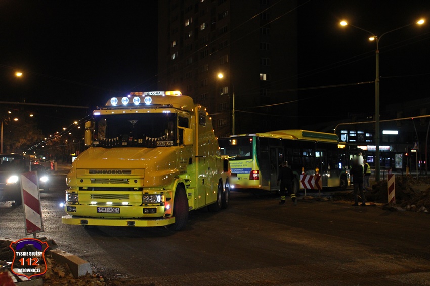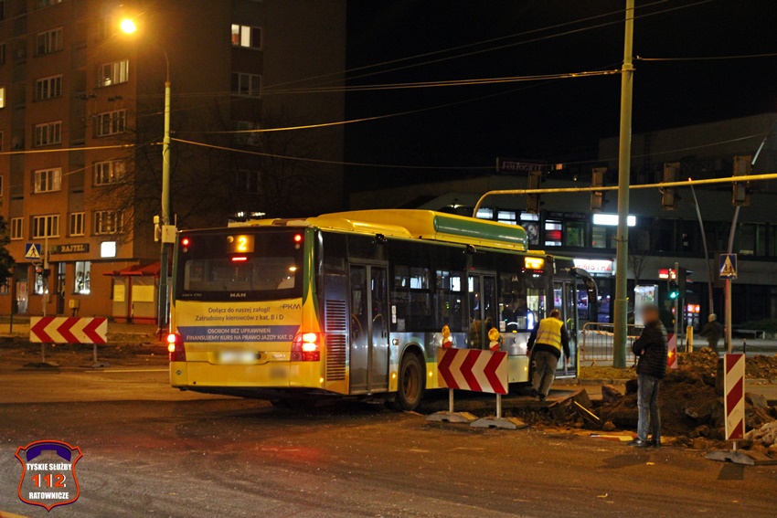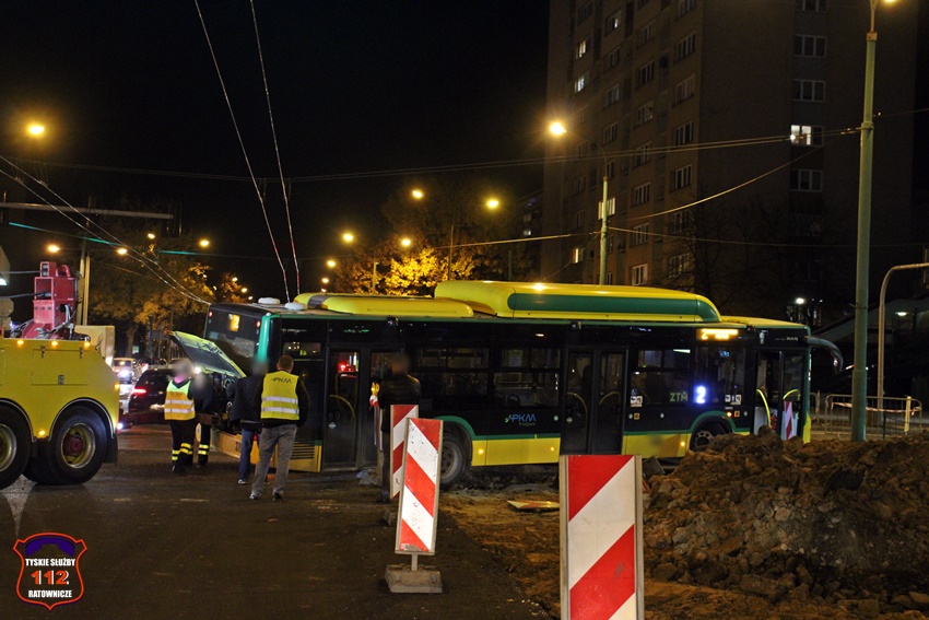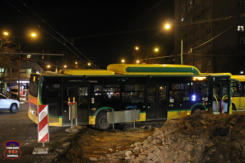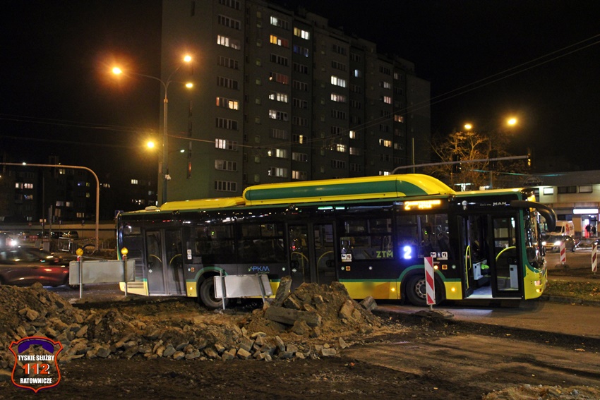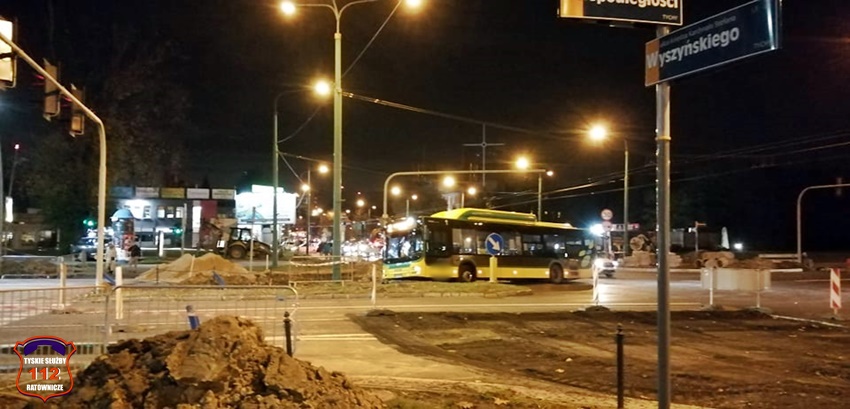 3 listopada po godzinie 17:20 na skrzyżowaniu ul. Wyszyńskiego i al. Niepodległości doszło do groźnie wyglądającego zdarzenia drogowego z udziałem autobusu komunikacji miejskiej należącego do PKM Tychy. Podczas wykonywania manewru skrętu w prawo z ul. Wyszyńskiego w al. Niepodległości doszło do osunięcia się ziemi pod tylnymi kołami autobusu. Autobus dosłownie zawisł prawymi tylnymi kołami nad wykopem. Ruch na al. Niepodległości w kierunku UM Tychy został całkowicie zablokowany. Kierowca autobusu o sytuacji powiadomił dyspozytora PKM-u. Dyspozytor na miejsce zdarzenia wezwał pomoc drogową. Po kilkunastu minutach pomoc drogowa była już na miejscu. O zdarzeniu poinformowany został również dyżurny KMP Tychy, który na miejsce skierował jeden z podległych patroli WRD. Pracownicy pomocy drogowej przy użyciu ciężkiego holownika wydostali autobus z potrzasku. Utrudnienia w ruchu w tym miejscu trwały około godziny. Z uzyskanych informacji wynika, że nie był to pierwszy przypadek na tym skrzyżowaniu gdzie uszkodzony został pojazd komunikacji miejskiej. Ograniczenia w ruchu wprowadzone na czas przebudowy tego skrzyżowania w znacznym stopniu utrudniają ruch pojazdom komunikacji miejskiej jak i służb komunalnych.