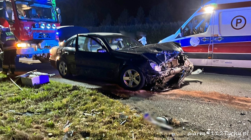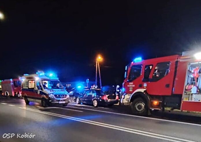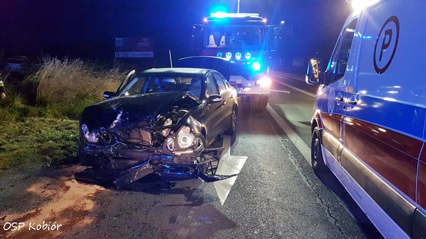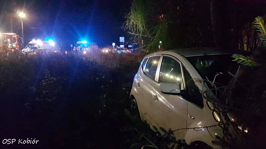 11 listopada około godziny 18 dyżurny SK KM PSP Tychy otrzymał zgłoszenie o zdarzeniu drogowym na ul. Przelotowej w rejonie skrzyżowania z ul. Łukową i Ołtuszewskiego w Kobiórze. Na miejsce zdarzenia natychmiast zadysponowane zostały zastępy OSP Kobiór (GBARt), JRG Tychy (GBA, SCRt), ZRM oraz patrol pszczyńskiej Policji. Na czas działań ratunkowych ruch w miejscu zdarzenia został całkowicie zablokowany. W zdarzeniu brały udział dwa samochodu osobowe: Mercedes i Kia. W wyniku zdarzenia Kia zatrzymała się w zaroślach kilkanaście metrów od drogi. Ze wstępnych ustaleń pracujących na miejscu Policjantów wynika, że sprawcą zdarzenia jest kierowca samochodu Kia (18 lat), który jadąc ul. Ołtuszewskiego w kierunku ul. Łukowej nie ustąpił pierwszeństwa przejazdu kierowcy Mercedesa (63 lata), który jechał ul. Przelotową w kierunku Tychów. Na szczęście w wyniku tego zdarzenia nikt nie doznał poważniejszych obrażeń, które skutkowałyby leczeniem szpitalnym. Obaj kierowcy w chwili zdarzenia byli trzeźwi. Uszkodzone pojazdy zostały odholowane przez pomoc drogową. Utrudnienia w ruchu w miejscu zdarzenia trwały ponad godzinę. Policjanci KPP Pszczyna prowadza dalsze postępowanie w sprawie tego zdarzenia.