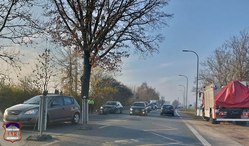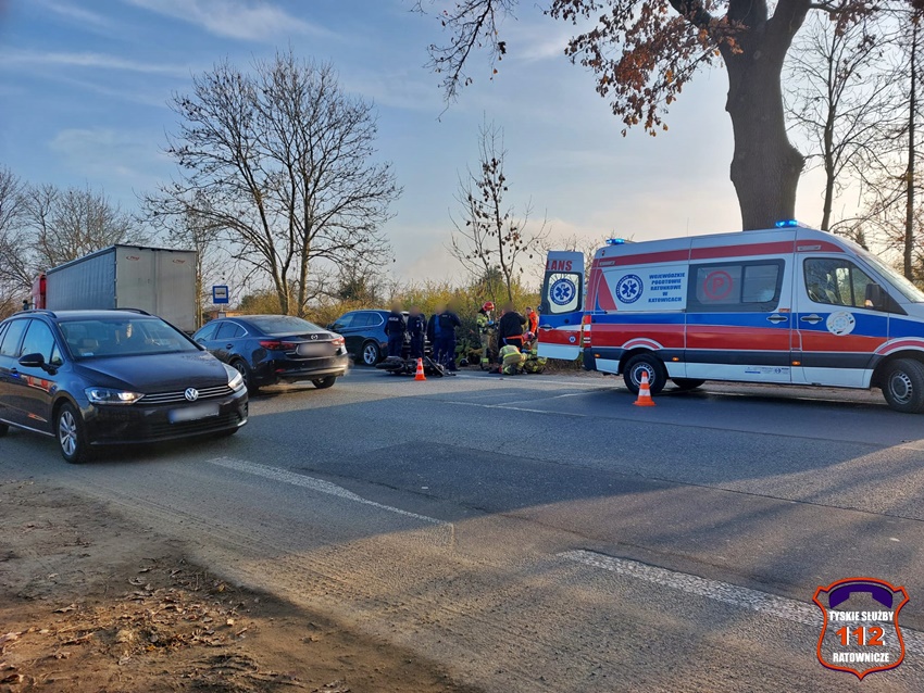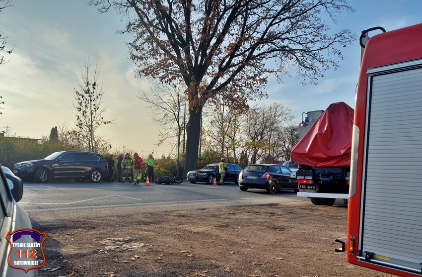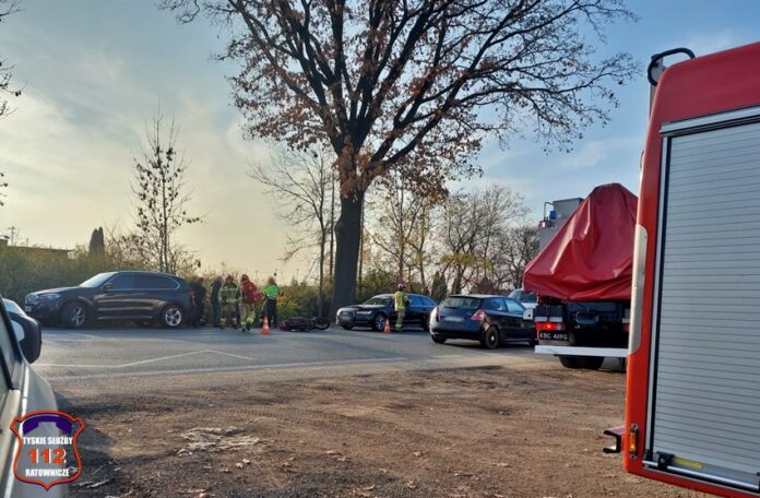 16 listopada około godziny 13:50 na ul. Oświęcimskiej w rejonie skrzyżowania z ul. Marzanny w kierunku Bierunia doszło do zdarzenia drogowego z udziałem motocyklisty. Na miejsce zdarzenia zadysponowane zostały zastępy JRG Tychy (GBA, SCRt), ZRM oraz patrol Policji. Ze wstępnych ustaleń wynika, że motocyklista hamował aby nie uderzyć w poprzedzający pojazd. Podczas tego manewru przewrócił się i upadł. W wyniku upadku motocyklista doznał urazu ręki (złamanie) i po udzieleniu KPP przez strażaków został przetransportowany przez ratowników medycznych do szpitala. Policjanci KMP Tychy prowadzą dalsze postępowanie w tej sprawie.