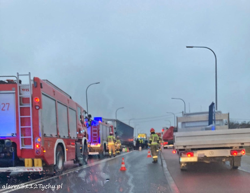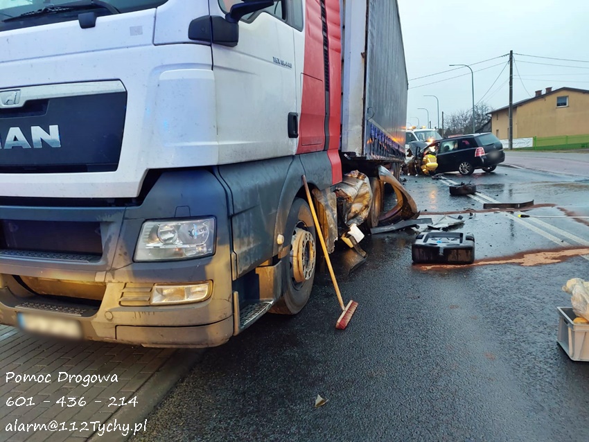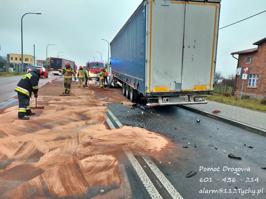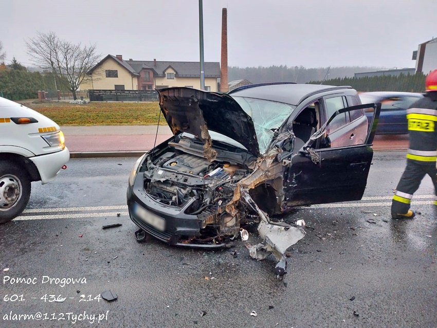 29 listopada około godziny 7 na ul. Oświęcimskiej (DK 44) doszło do zdarzenia drogowego z udziałem osobowego Opla i ciągnika siodłowego MAN z naczepą. Na miejsce zdarzenia zadysponowane zostały zastępy JRG Tychy (GBA, GCBARt, SCRt) oraz patrole Policji. W miejscu zdarzenia występowały utrudnienia w ruchu. Ze wstępnych ustaleń pracujących na miejscu Policjantów wynika, że sprawcą zdarzenia jest kierowca osobowego Opla, który z niewyjaśnionych przyczyn zjechał na przeciwległy pas i uderzył w bok ciągnika siodłowego uszkadzając jego zbiornik paliwa. Z uszkodzonego zbiornika wyciekło paliwo. Kierowca Opla nie doznał poważniejszych obrażeń i nie potrzebował pomocy medycznej. Na czas działań ruch został zablokowany, a Policja wyznaczyła objazdy. Około godziny 11 uszkodzone pojazdy zostały odholowane. Po godzinie 11:30 droga została otwarta dla ruchu. Policjanci KMP Tychy prowadzą dalsze postępowanie w tej sprawie.