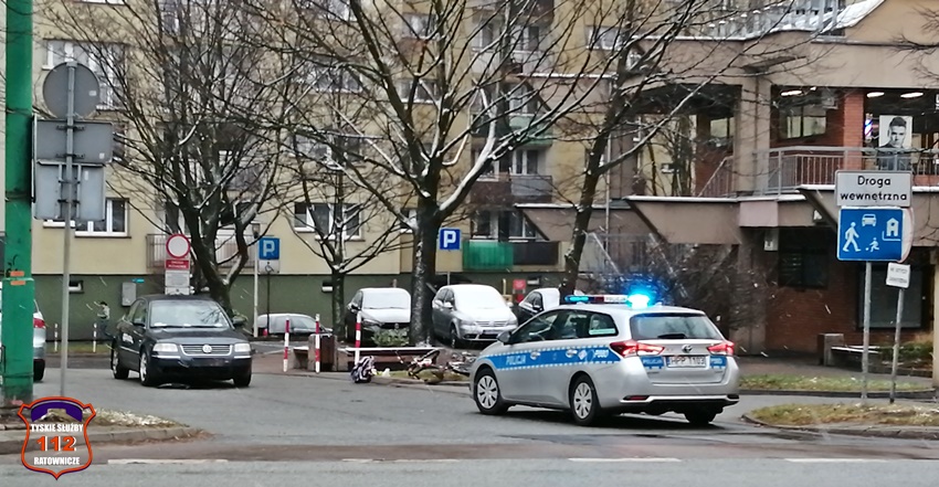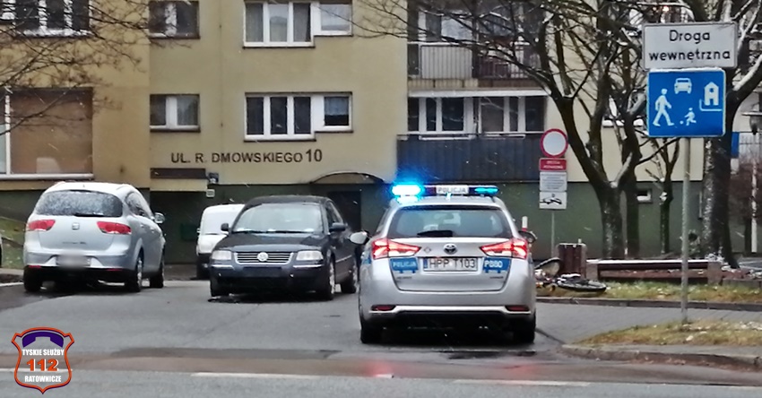 30 listopada około godziny 7 na osiedlowym parkingu wzdłuż ul. Dmowskiego (przy aptece) doszło do zdarzenia drogowego z udziałem rowerzysty i samochodu osobowego. Na miejsce zdarzenia wezwane zostały: ZRM, zastęp JRG Tychy (GBA) oraz patrol Policji. Na czas działań wjazd na parking przy budynku wielorodzinnym został przyblokowany. Rowerzysta po udzieleniu kwalifikowanej pierwszej pomocy przez strażaków został przekazany pod opiekę ratowników medycznych, a następnie został przewieziony do szpitala na dokładną diagnostykę. Ze wstępnych ustaleń pracujących na miejscu Policjantów wynika, że rowerzysta (61 lat) wyjechał zza zaparkowanych pojazdów wprost pod koła osobowego VW, kierowanego przez mężczyznę (33 lata). To właśnie rowerzysta został uznany winnym spowodowania zdarzenia i ukarano go mandatem karnym. Działania na miejscu trwały około dwóch godzin.