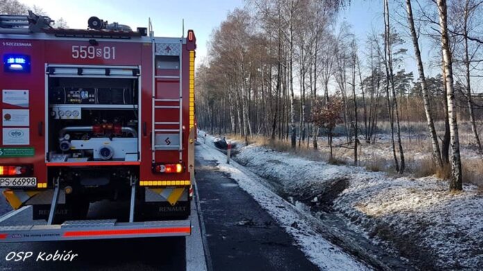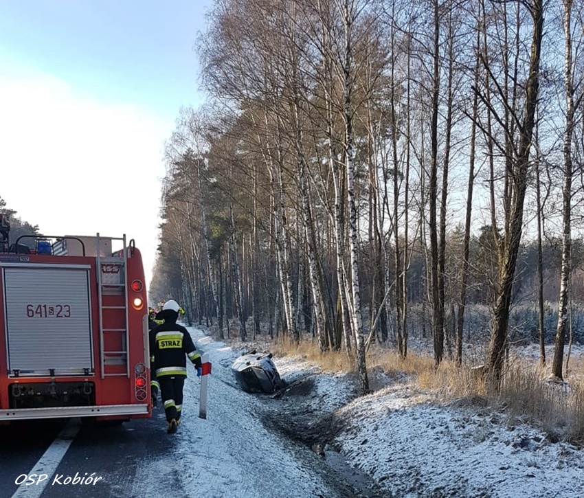 26 grudnia około godziny 10:50 dyżurny SK KM PSP Tychy otrzymał zgłoszenie o samochodzie osobowym (Opel Corsa) w rowie trasie DK 1 w Kobiórze. Ze zgłoszenia wynikało, że samochodem podróżowała rodzina z dzieckiem. Na miejsce zdarzenia natychmiast zadysponowane zostały: ZRM, zastępy OSP Kobiór, KM PSP/JRG Tychy oraz patrol Policji. Po dotarciu na miejsce zgłoszenie zostało potwierdzone. Na czas działań prawy pas w kierunku Pszczyny został wyłączony z ruchu. Osoby podróżujące osobówką trafiły pod opiekę ratowników medycznych, a następnie dziecko zostało przewiezione do szpitala w Katowicach Ligocie na profilaktyczne badania. Ze wstępnych ustaleń pracujących na miejscu Policjantów wynika, że przyczyną zdarzenia było niedostosowanie prędkości do panujących warunków. Kierowca Opla został ukarany mandatem. Utrudnienia w ruchu trwały około godziny.