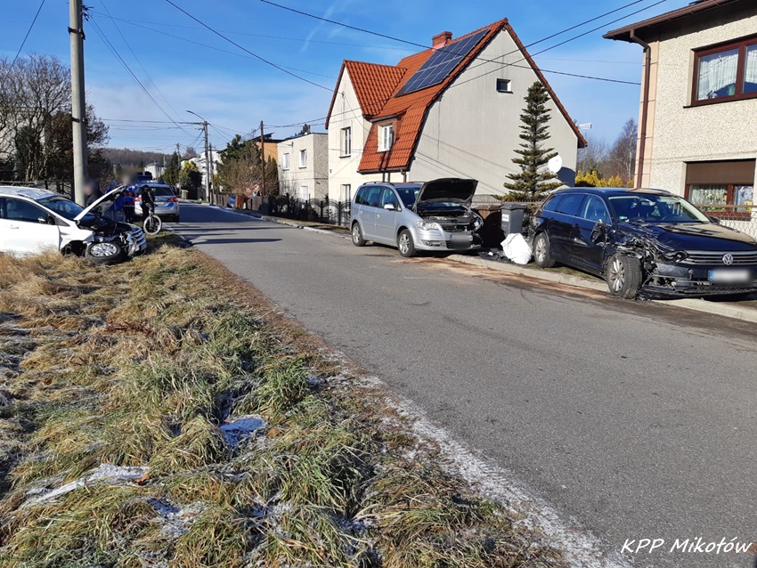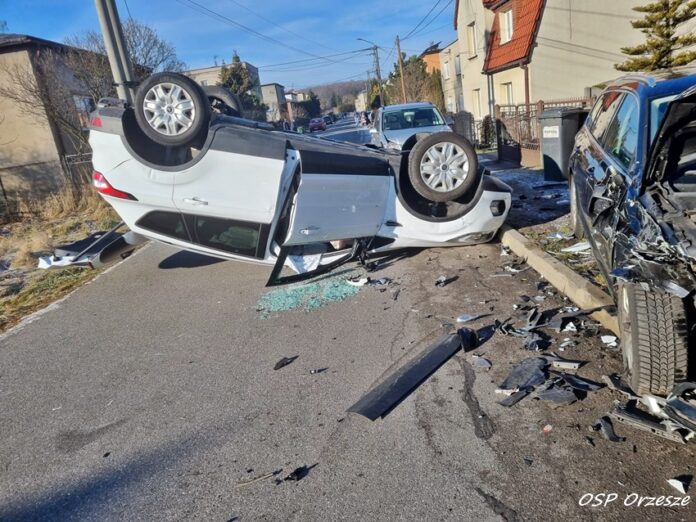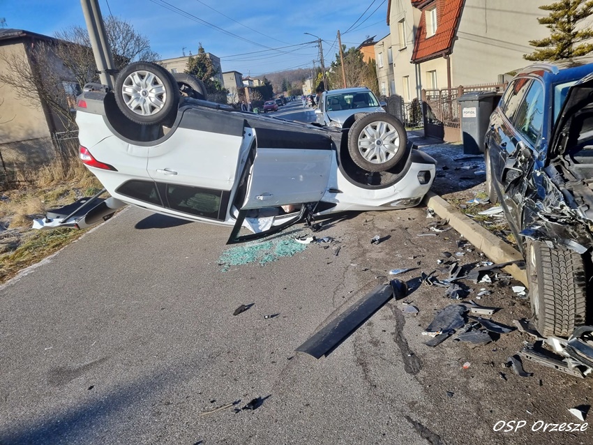 7 stycznia około godziny 10:30 dyżurny SK KP PSP Mikołów otrzymał zgłoszenie o dachowaniu samochodu osobowego na ul. 22 lipca w Orzeszu Jaśkowicach. Na miejsce natychmiast zadysponowane zostały zastępy OSP Orzesze, KP PSP/JRG Mikołów, ZRM oraz patrole Policji. Na czas działań ruch na ulicy gdzie doszło do zdarzenia został całkowicie zablokowany. Po dotarciu na miejsce okazało się, że w zdarzeniu brały udział łącznie trzy pojazdy: dwa auta marki VW i jeden Ford. Ze wstępnych ustaleń pracujących na miejscu Policjantów wynika, że sprawcą zdarzeni jest kierowca (63 lata) samochodu Ford, który nie dostosował prędkości do warunków na drodze, wpadł w poślizg i uderzył w dwa zaparkowane VW. W wyniku uderzenia w te pojazdy dachował. Z obrażeniami ciała trafił pod opiekę ratowników medycznych i został przetransportowany do szpitala na dokładną diagnostykę. Utrudnienia w ruchu trwały około godziny. Mikołowscy Policjanci prowadzą dalsze postępowanie w tej sprawie.