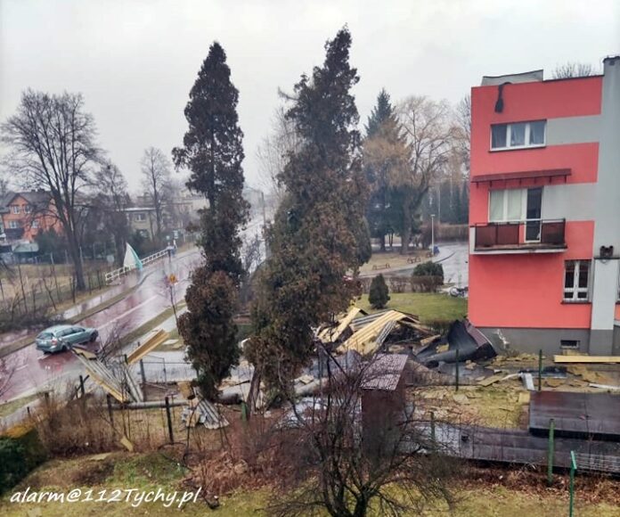 17 lutego od godzin porannych strażacy KM PSP/JRG Tychy wspierani prze druhów i druhny jednostek OSP powiatu bieruńsko – lędzińskiego usuwają skutki wichury, która przechodzi nad Naszym regionem. Do najpoważniejszego zdarzenia doszło w Bieruniu przy ul. Chemików gdzie z budynku został zerwany dach, który spowodował dodatkowe straty w mieniu. Poza zerwanym dachem, licznymi wiatrołomami strażacy usuwali porwane przez wiatr namioty (szklarnie), banery reklamowe, pochylone znaki drogowe i zerwane przewody telekomunikacyjne. Dodatkowo w związku z wiatrem dochodziło do tzw. cofki i w kilku mieszkaniach na terenie miasta załączały się czujki tlenku węgla. Dyżurni SK KM PSP Tychy cały czas otrzymują nowe zgłoszenia.