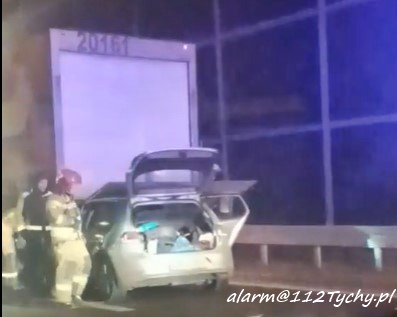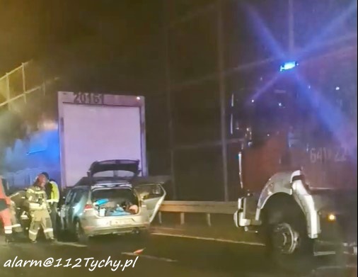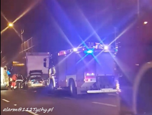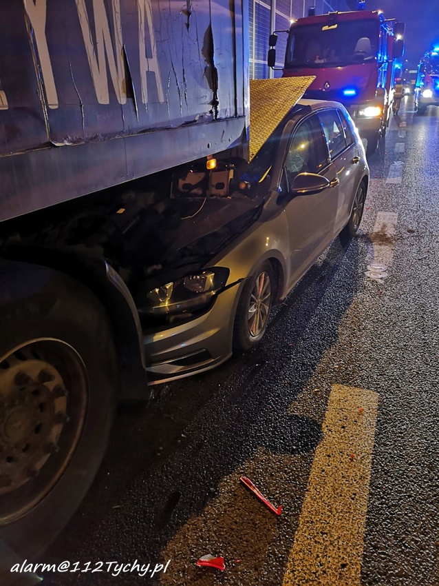 7 marca około godziny 19:40 na ul. Beskidzkiej (DK 1) przed zjazdem w ul.. Dzwonkową doszło do zdarzenia drogowego z udziałem samochodu osobowego i ciągnika siodłowego z naczepą. Na miejsce zdarzenia zadysponowane zostały: zastępy straży pożarnej KM PSP/JRG Tychy, ZRM oraz patrole Policji. Na czas działań ratunkowych w stronę Pszczyny ruch odbywał się tylko lewym skrajnym pasem. Kierowca osobówki trafił pod opiekę ratowników medycznych ale nie doznał poważniejszych obrażeń i odmówił dalszych badań. Z ustaleń pracujących na miejscu Policjantów wynika, że kierowca VW nie zachował należytej ostrożności i uderzył w tył naczepy. W trakcie czynności okazało się, co było przyczyną dekoncentracji kierowcy osobówki, badanie alkomatem wykazało bowiem u niego 0,92mg/l co daje około 2 promile alkoholu w wydychanym powietrzu. Mężczyzna został zatrzymany i przewieziony do KMP Tychy celem wykonania dalszych czynności. Pojazd sprawcy został zabezpieczony i odholowany na parking policyjny. Utrudnienia w ruchu potrwają kilak godzin. Policjanci KMP Tychy prowadzą dalsze postępowanie w tej sprawie.