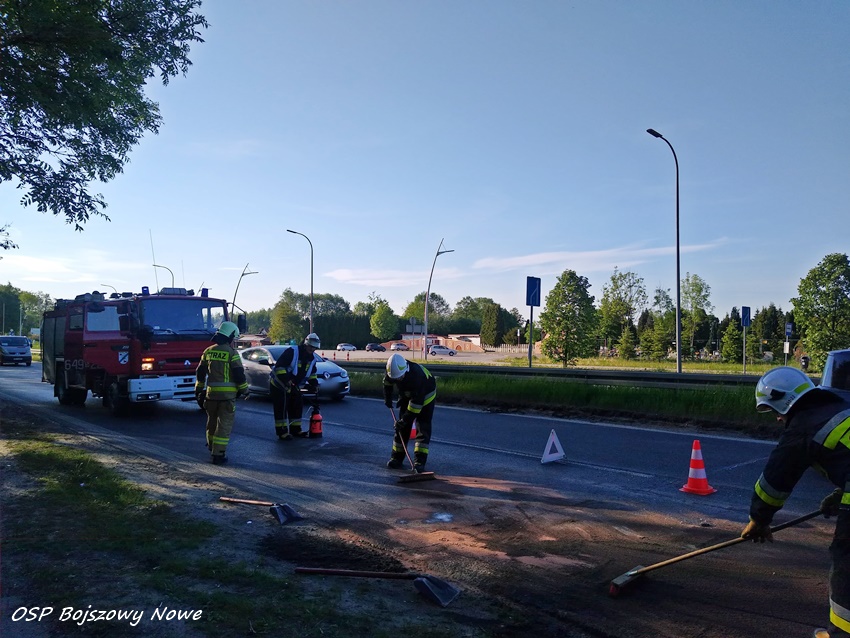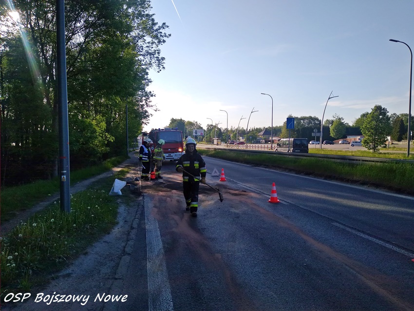 16 maja około godziny 17:47 dyżurny SK KM PSP Tychy otrzymał zgłoszenie o plamie oleju na ul. Oświęcimskiej w rejonie zjazdu na trasę DK 1. Na miejsce zadysponowany został zastęp OSP Bojszowy Nowe (z zabezpieczenia KM PSP Tychy). Po dotarciu na miejsce zgłoszenie zostało potwierdzone. Przy użyciu sorbentu strażacy zneutralizowali zagrożenie. Działania na miejscu trwały około godziny.