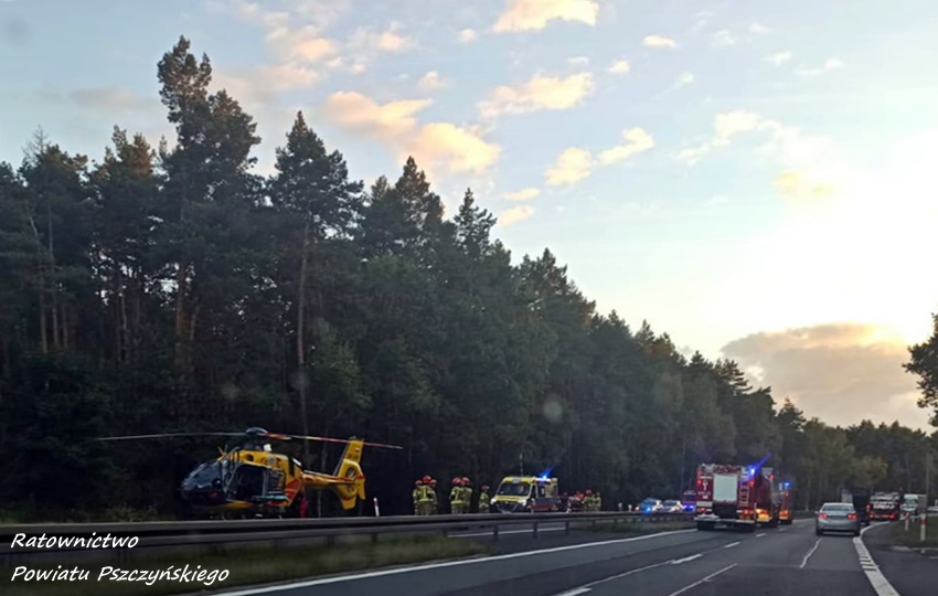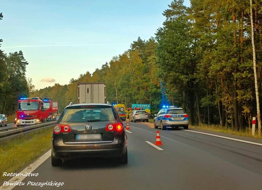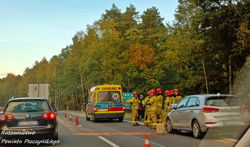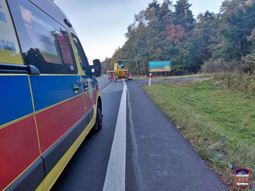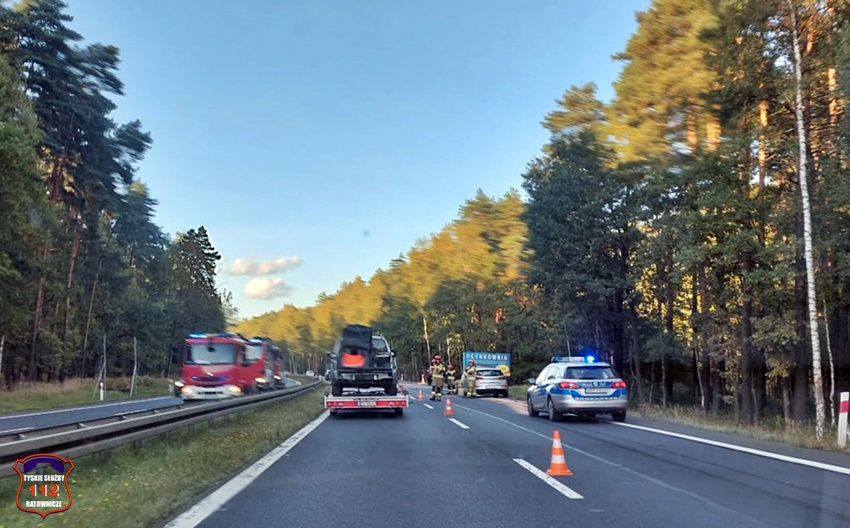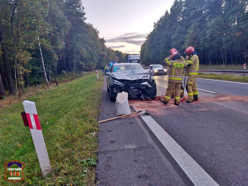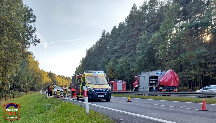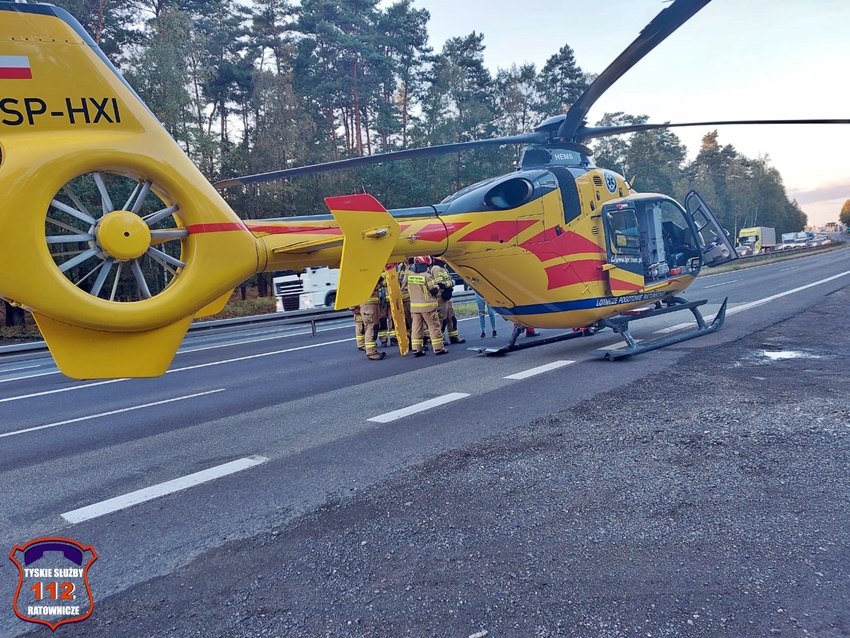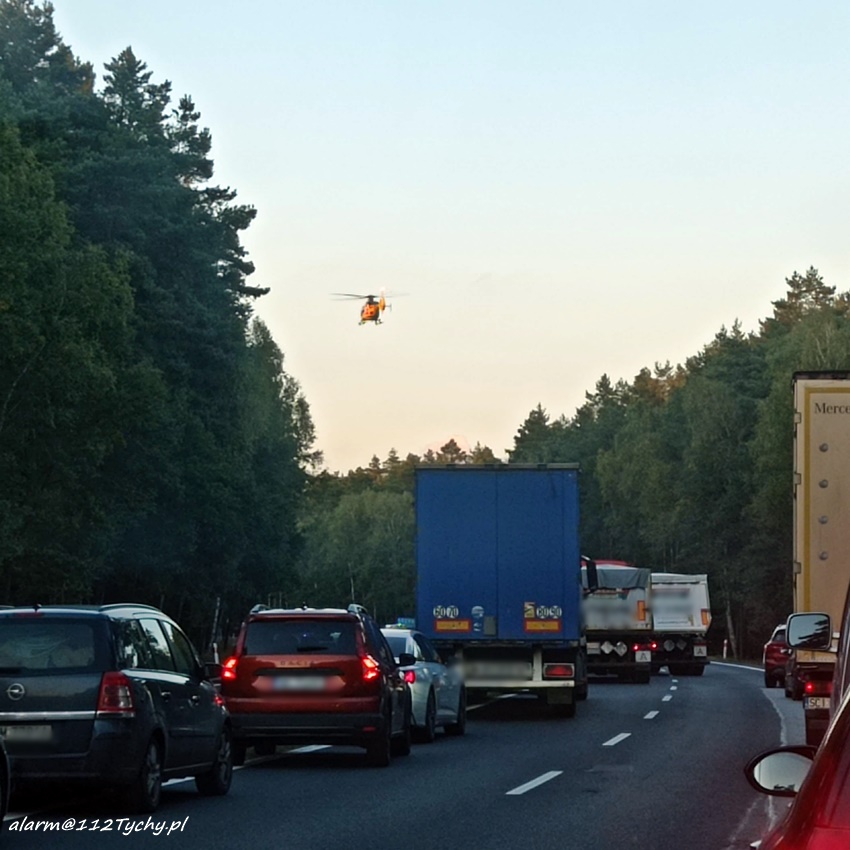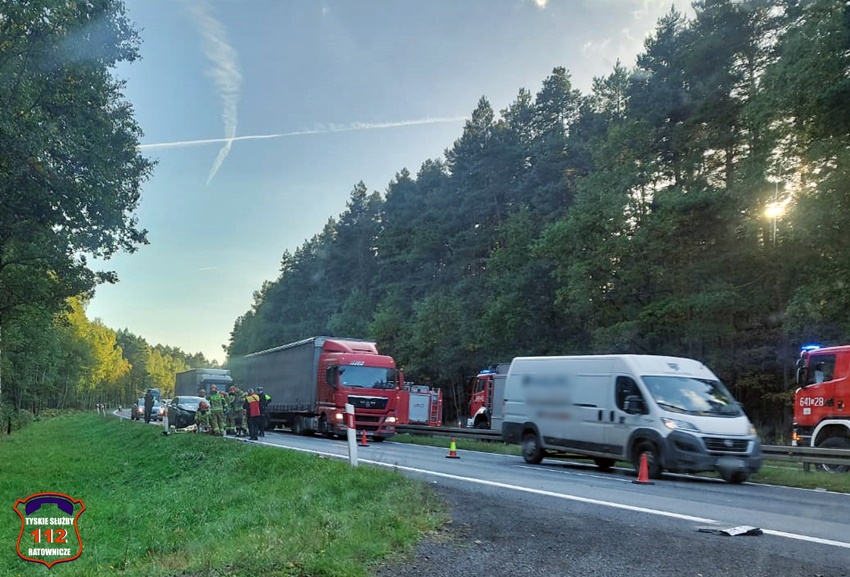 4 października około godziny 17 na trasie DK 1 w Kobiórze (pas na Tychy) doszło do zdarzenia drogowego z udziałem dwóch pojazdów. W tył samochodu ciężarowego uderzył samochód osobowy. W zdarzeniu brały udział ciężarowy Man oraz osobowy Hyundai. Na miejsce zdarzenia zadysponowane zostały zastępy KM PSP/JRG Tychy, ZRM, patrole Policji KPP Pszczyna, zastępy KP PSP/JRG Pszczyna oraz śmigłowiec LPR – Ratownik 4. Ruch w miejscu zdarzenia odbywał się jednym pasem w każdym kierunku. Kierowcy osobówki kwalifikowanej pierwszej pomocy udzielili strażacy KM PSP/JRG Tychy, a po przybyciu na miejsce ratowników medycznych został on im przekazany. Decyzją ratowników mężczyzna (24 lata) został drogą lotniczą przetransportowany do szpitala w Katowicach Ochojcu (podejrzenie urazu kręgosłupa). Kierowcy samochodu ciężarowego (mężczyzna 32 lata) nic się nie stało. Na czas interwencji latającej karetki w miejscu zdarzenia ruch był wstrzymany całkowicie. Ze wstępnych ustaleń pracujących na miejscu Policjantów wynika, ze kierowca osobówki z niewyjaśnionych przyczyn zjechał na prawy pas i uderzył w tył samochodu ciężarowego. Utrudnienia w ruchu trwały około trzech godzin. Policjanci KPP Pszczyna prowadzą dalsze czynności w sprawie tego zdarzenia.
