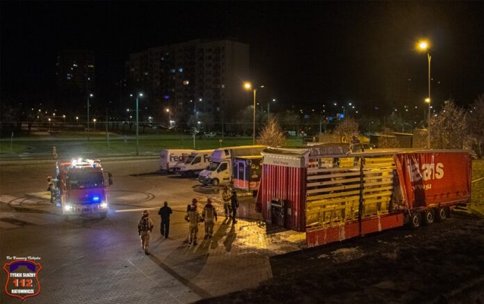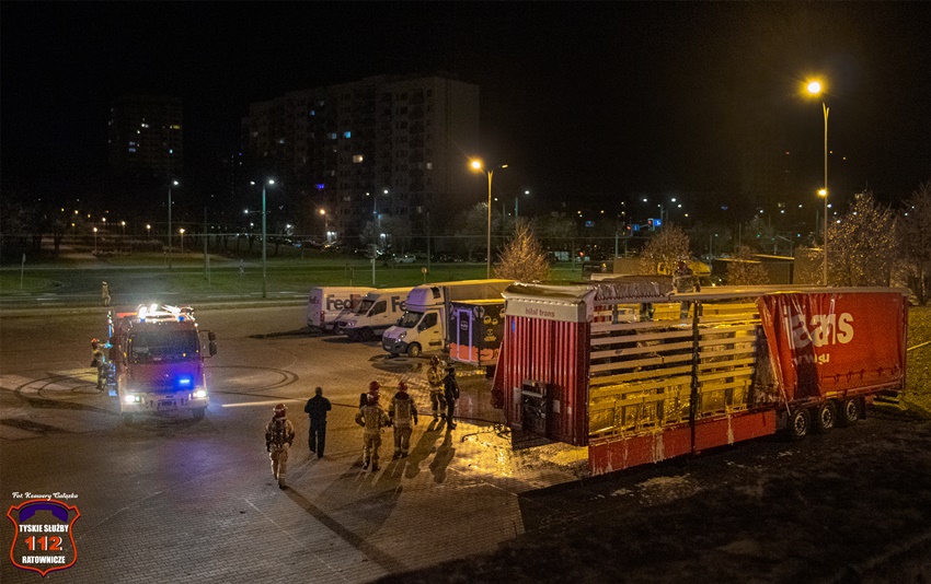 1 stycznia o godzinie 1:37 dyżurny SK KM PSP Tychy otrzymał zgłoszenie o pożarze naczepy samochodu ciężarowego na parkingu przy al. Piłsudskiego 20. Na miejsce natychmiast zadysponowane zostały zastępy KM PSP/JRG Tychy oraz patrol Policji. Po przybyciu na miejsce strażacy podali dwa prądy wody celem ugaszenia pożaru. Po ugaszeniu pożaru strażacy przystąpili do dokładnego sprawdzenia naczepy. Najprawdopodobniej do pożaru doszło w wyniku fajerwerków. Na czas działań gaśniczych zabezpieczenie rejonu operacyjnego KM PSP Tychy pełnił zastęp OSP Lędziny. Trwa ustalanie dokładnych przyczyn i okoliczności tego pożaru.
