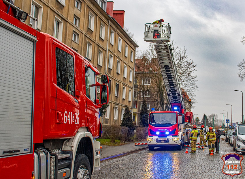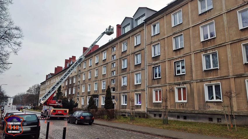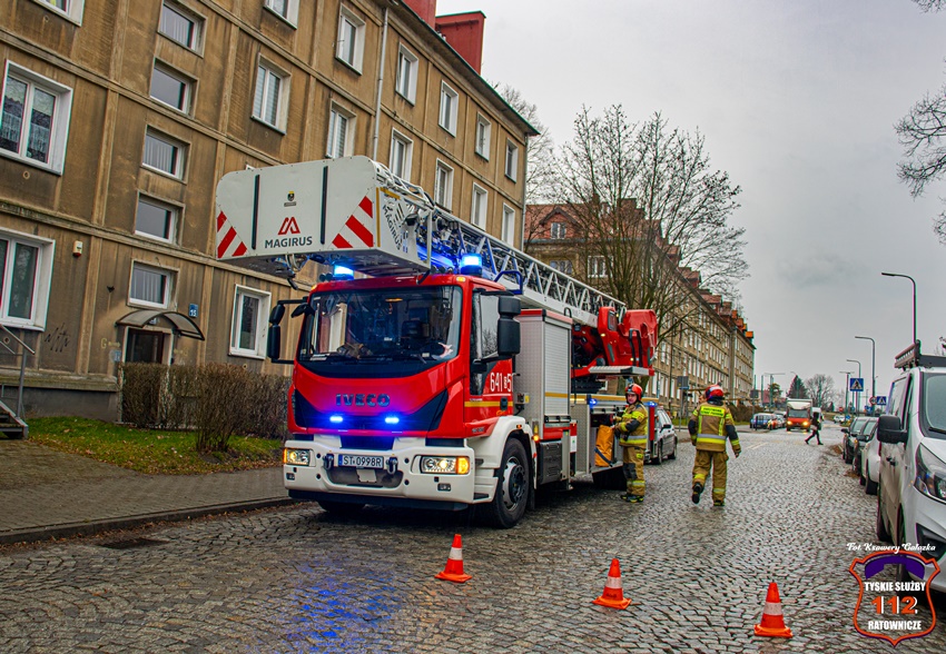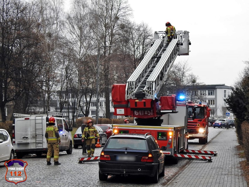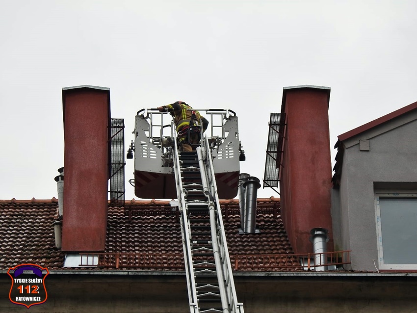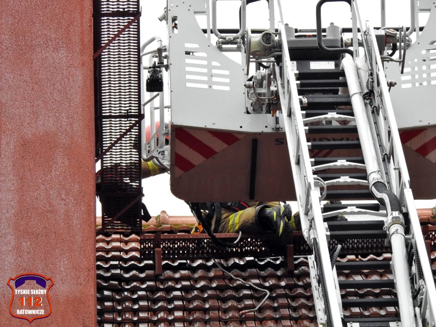 17 lutego około godziny 14 dyżurny SK KM PSP Tychy otrzymał zgłoszenie o uszkodzonym opierzeniu dachu budynku wielorodzinnego przy ul. Cienistej. Na miejsce zgłoszenie zadysponowane zostały zastępy KM PSP/JRG Tychy oraz przedstawiciel administratora budynku. Po przybyciu na miejsce zgłoszenie zostało potwierdzone. Przy użyciu drabiny mechanicznej strażacy dostali się na dach budynku i zabezpieczyli niebezpieczny element. Na czas działań ruch na ul. Cienistej był całkowicie wstrzymany. Działania trwały około dwóch godzin.