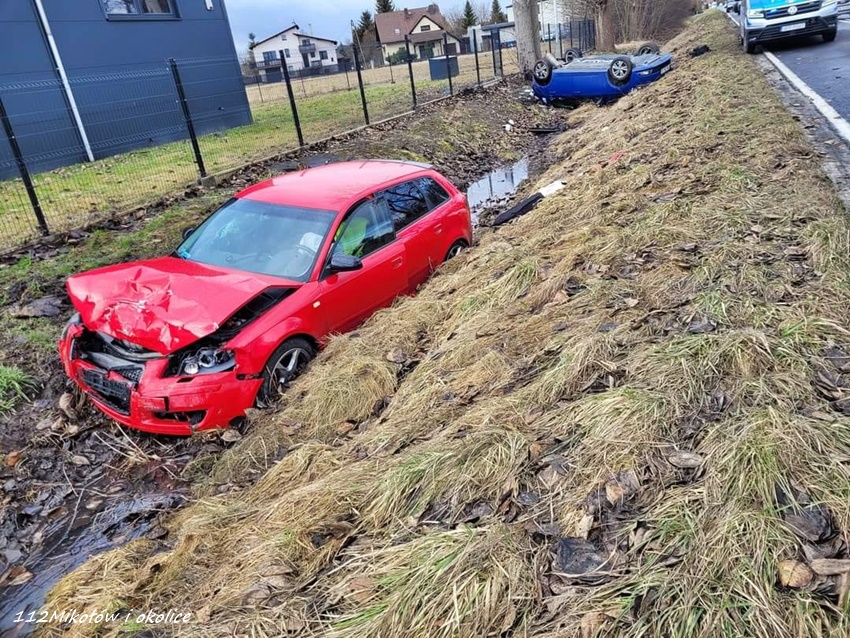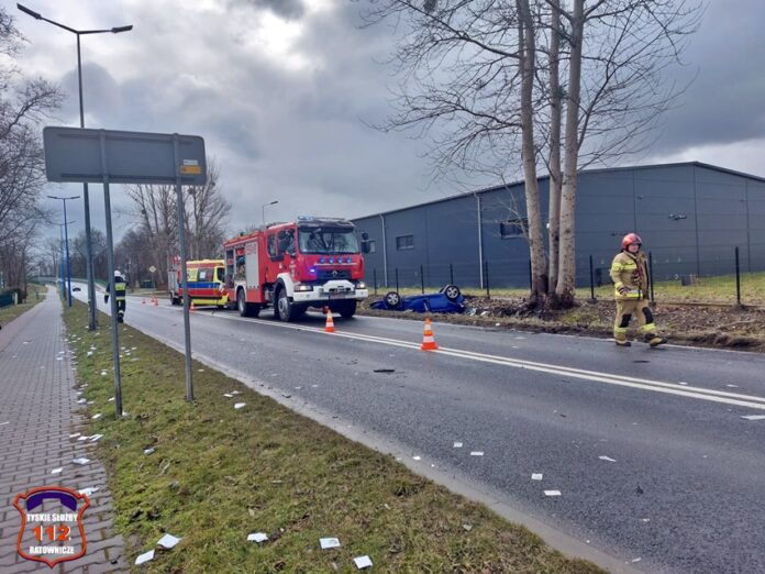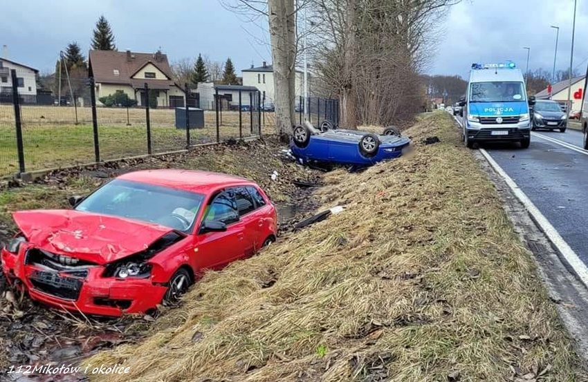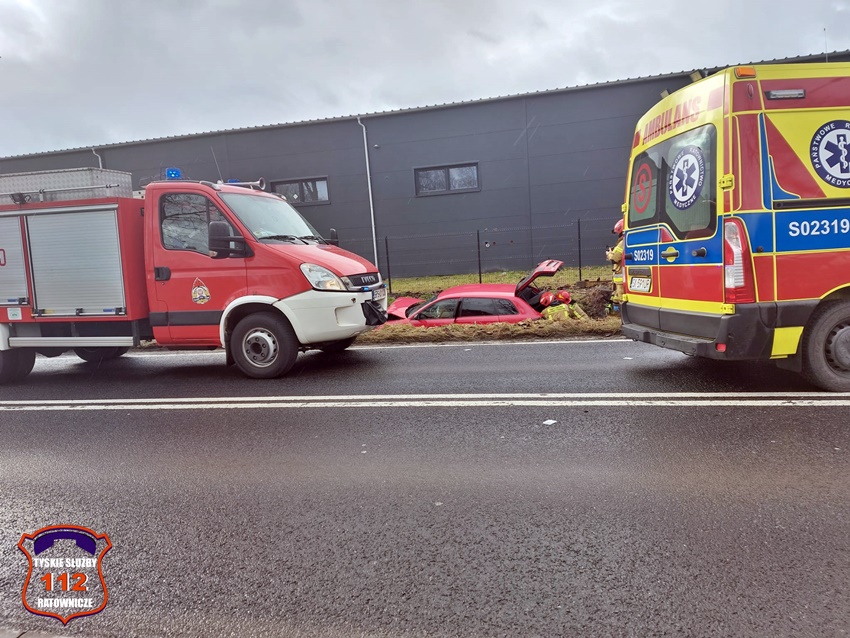 21 lutego około godziny 11 na ul. Centralnej w Kobiórze doszło do zdarzenia drogowego z udziałem dwóch samochodów osobowych. W tył Skody z dużą siła uderzyło Audi. Po zderzeniu oba pojazdy wylądowały w przydrożnym rowie, a Skoda dodatkowo dachowała. Na miejsce zadysponowane zostały: ZRM, zastępy OSP Kobiór, JRG Pszczyna, JRG Mikołów oraz Policja. Na czas działań ratunkowych droga była całkowicie zablokowana. Kierująca Skodą kobieta (42 lata) trafiła pod opiekę ratowników medycznych i została przetransportowana do szpitala. Kierowca Audi porzucił swój pojazd i pasażera, a następnie oddalił się z miejsca zdarzenia nie udzielając poszkodowanej pomocy. Pasażer, który pozostał na miejscu był w stanie nietrzeźwości. Ze wstępnych ustaleń pracujących na miejscu Policjantów wynika, że do zdarzenia doszło chwilę po tym jak kierujaca Skodą kobieta wjechała na ul. Centralną z ul. Zachodniej. Technik kryminalistyki pracujący na miejscu zdarzenia wykonał pełną dokumentację zdjęciową oraz zabezpieczył wszystkie ślady (m. in. odciski palców z kierownicy pojazdu). Utrudnienia w ruchu i działania na miejscu trwały blisko dwie godziny. Policjanci KPP Pszczyna prowadzą poszukiwania kierowcy Audi oraz dalsze czynności w sprawie tego zdarzenia.
