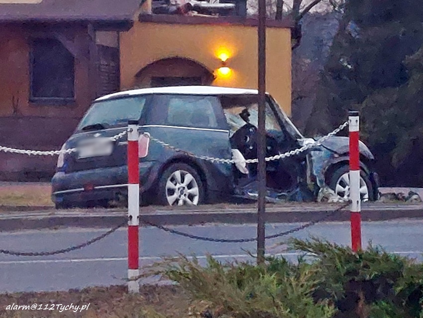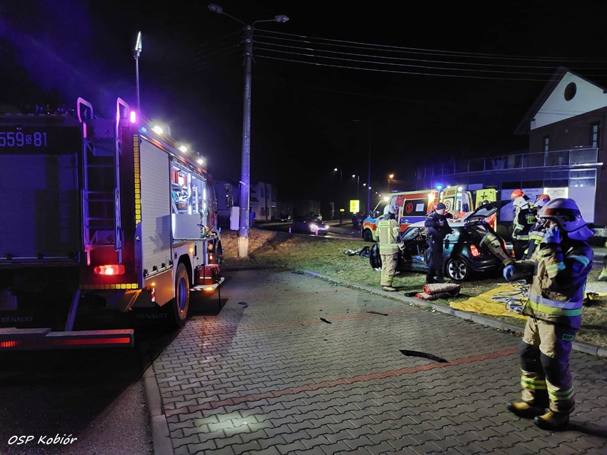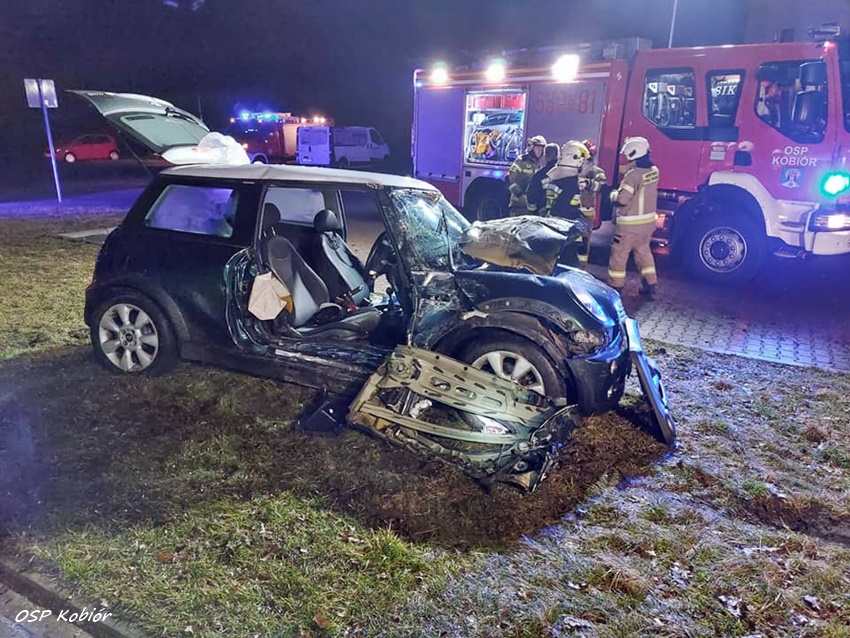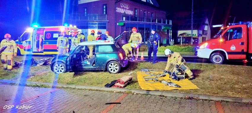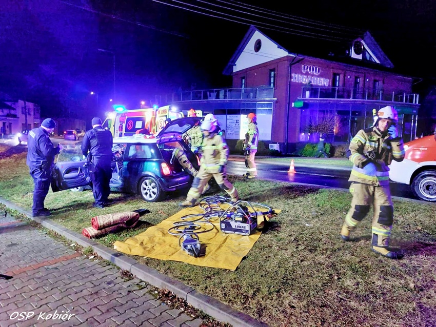 9 marca około godziny 4:50 na ul. Centralnej w Kobiórze doszło do zdarzenia drogowego z udziałem samochodu osobowego. Na łuku drogi kierujący osobowym Mini mężczyzna utracił panowanie nad pojazdem i uderzył bokiem w betonowy słup energetyczny. Na miejsce zdarzenia zadysponowane zostały: ZRM, zastępy strażaków z OSP Kobiór, JRG Pszczyna, JRG Tychy oraz patrole pszczyńskiej Policji. Po przybyciu na miejsce strażacy przy użyciu narzędzi hydraulicznych wykonali dostęp do poszkodowanego mężczyzny. W trakcie czynności od kierowcy pojazdu wyczuwalna była silna woń alkoholu. Mężczyzna z obrażeniami głowy trafił pod opiekę ratowników medycznych, a następnie został przetransportowany do szpitala gdzie poza badaniami pobrana zostanie mu krew na obecność alkoholu i innych środków, wyniki: 2,6 promila alkoholu oraz obecność substancji psychoaktywnych – THC, czyli marihuany. Policjanci zatrzymali mu prawo jazdy. W trakcie działań dyżurny KPP Pszczyna otrzymał zgłoszenie od właścicielki pojazdu, że pojazd został przywłaszczony przez mężczyznę, który rozbił go na słupie. Po wykonaniu wszystkich czynności wrak został zabezpieczony i przetransportowany na policyjny parking. Policjanci KPP Pszczyna prowadzą dalsze postępowanie w tej sprawie.