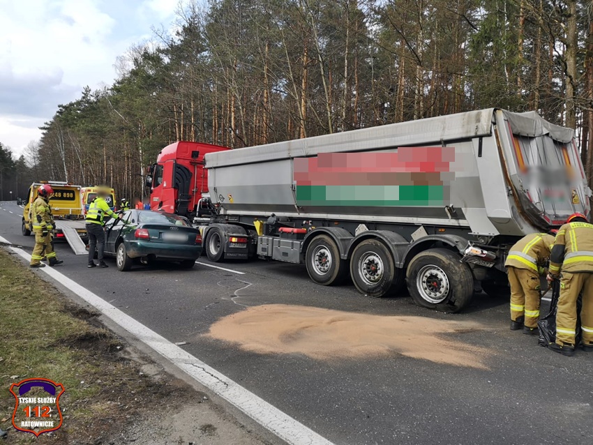 10 marca około godziny 14:15 na trasie DK 86 przed łącznikiem z ul. Katowicką doszło do groźnie wyglądającego zdarzenia drogowego. W tył naczepy uderzyło osobowe Audi. Na miejsce zdarzenia zadysponowane zostały: ZRM, zastępy JRG Tychy oraz Policja. Na czas działań ratunkowych ruch na pasie w Katowic był całkowicie zablokowany. Kierowca osobówki trafił pod opiekę ratowników medycznych. Z ustaleń pracujących na miejscu Policjantów wynika, że ciągnik siodłowy marki Renault z naczepą stał na prawym pasie, ponieważ doszło do jego awarii (uszkodzone koło). Kierowca Audi nie zachował należytej ostrożności i uderzył w lewy tylni narożnik naczepy. Utrudnienia w ruchu w miejscu zdarzenia trwały prawie dwie godziny. Policjanci KMP Tychy prowadzą dalsze postępowanie w tej sprawie.