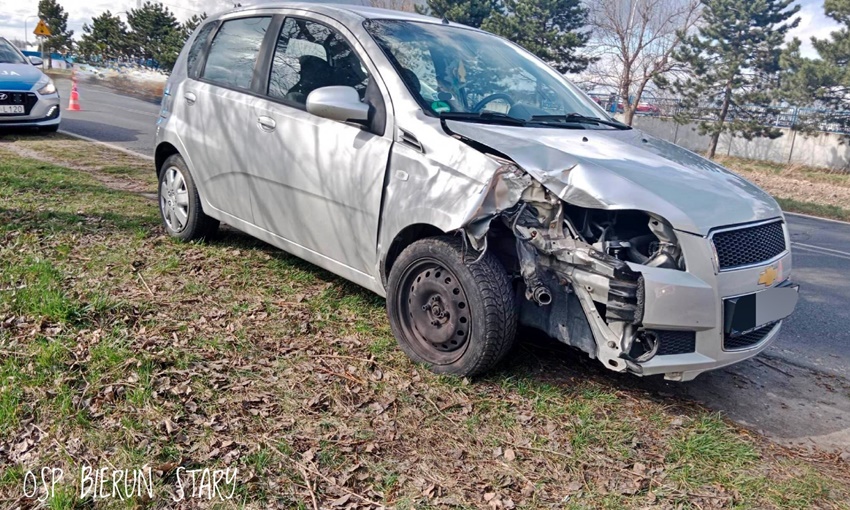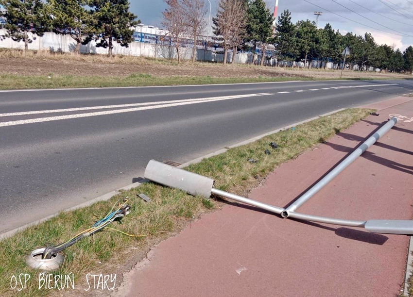 25 marca około godziny 13:50 dyżurny SK KM PSP Tychy otrzymał zgłoszenie o zdarzeniu drogowym na ul. Oświęcimskiej. Ze zgłoszenia wynikało, że kierująca osobowym Chevroletem uderzyła w uliczną latarnię ścinając ją. Na miejsce zdarzenia zadysponowany został zastęp strażaków z OSP Bieruń Stary oraz patrole Policji z Bierunia i Tychów. Po przybyciu na miejsce, zgłoszenie zostało potwierdzone. Kierująca osobówką nie doznała żadnych obrażeń. Dodatkowo na miejsce wezwane zostało pogotowie energetyczne, które zabezpieczyło wyrwane przewody. Działania na miejscu trwały około godziny.