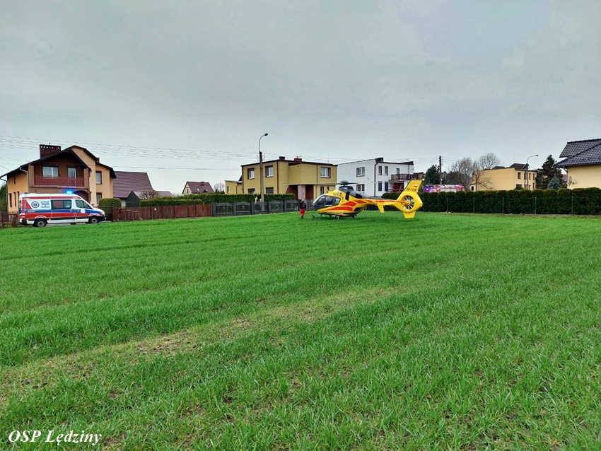 14 kwietnia około godziny 17:50 dyżurny SK KM PSP Tychy otrzymał zgłoszenie z prośbą pomoc ratownikom medycznym oraz o zabezpieczenie lądowiska dla latającej karetki przy ul. Małkowiec w Lędzinach. Ratownicy Medyczni zostali tam wezwani celem udzielenia pomocy mężczyźnie, który spadł z rusztowania. Do działań zadysponowany został zastęp OSP Lędziny. Strażacy pomogli ratownikom w transporcie poszkodowanego do śmigłowca oraz zabezpieczyli lądowisko. Poszkodowany mężczyzna drogą lotniczą został przetransportowany do szpitala w katowniach Ochojcu. Po około czterdziestu minutach działania na miejscu zostały zakończone.
