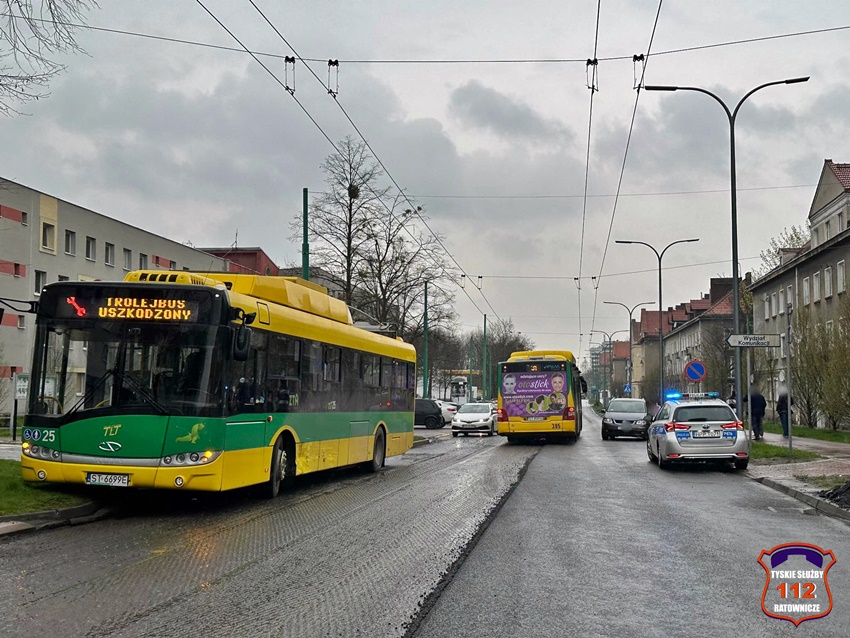17 kwietnia około godziny 17 na ul. Budowlanych w rejonie skrzyżowania z ul. Kochanowskiego doszło do zdarzenia drogowego z udziałem dwóch samochodów osobowych i trolejbus. Na miejsce zdarzenia zadysponowane zostały: ZRM i patrol Policji. W trakcie działań w miejscu zdarzenia występowały utrudnienia w ruchu. W VW podróżowała kobieta i dziecko. Oboje trafili pod opiekę ratowników medycznych. Z ustaleń pracujących na miejscu Policjantów sprawcą zdarzenia jest kierowca osobowego Peugeota, który włączając się do ruchu z ul. Kochanowskiego w Budowlanych nie ustąpił pierwszeństwa przejazdu kierującej VW. Na szczęście nie było konieczności ich hospitalizacji. W wyniku zderzenia tych pojazdów, VW uderzył jeszcze w trolejbus marki Solaris. Utrudnienia w ruchu w miejscu zdarzenia trwały ponad godzinę. Policjanci KMP Tychy prowadzą dalsze postępowanie w tej sprawie.