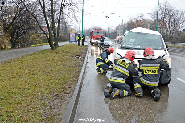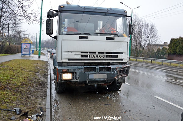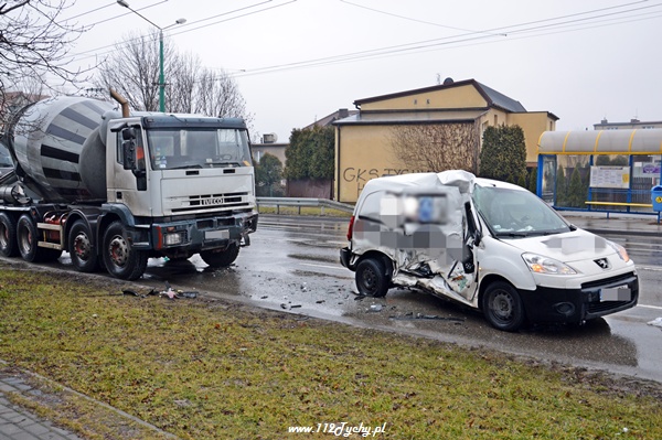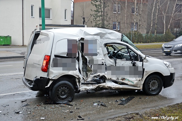 20 stycznia około godziny 12.30 na u. Piłsudskiego doszło do kolejnego w ostatnich dniach zdarzenia drogowego. Jadący od strony ul. Armii Krajowej samochód Peugeot Partner wpadł w poślizg i uderzył bokiem w nadjeżdżający z naprzeciwka samochód ciężarowy Iveco (gruszka). Na miejsce natychmiast zadysponowane zostały służby ratownicze w postaci: dwóch patroli Policji, karetki pogotowia oraz dwóch zastępów z JRG Tychy (GBA, SCRT). Kierujący samochodem osobowym z obrażeniami twarzo – czaszki został zabrany do szpitala. Na szczęście jechał sam. Samochód nadaje się tylko do kasacji. Działania strażaków polegały dodatkowo na zabezpieczeniu miejsca zdarzenia, odłączeniu zasilania w uszkodzonym pojeździe oraz neutralizacji rozlanych płynów eksploatacyjnych. Dodatkowo strażacy i Policjanci usunęli uszkodzony pojazd z drogi. W czasie działań jeden pas ruchu w kierunku ul. Armii Krajowej był wyłączony z ruchu.